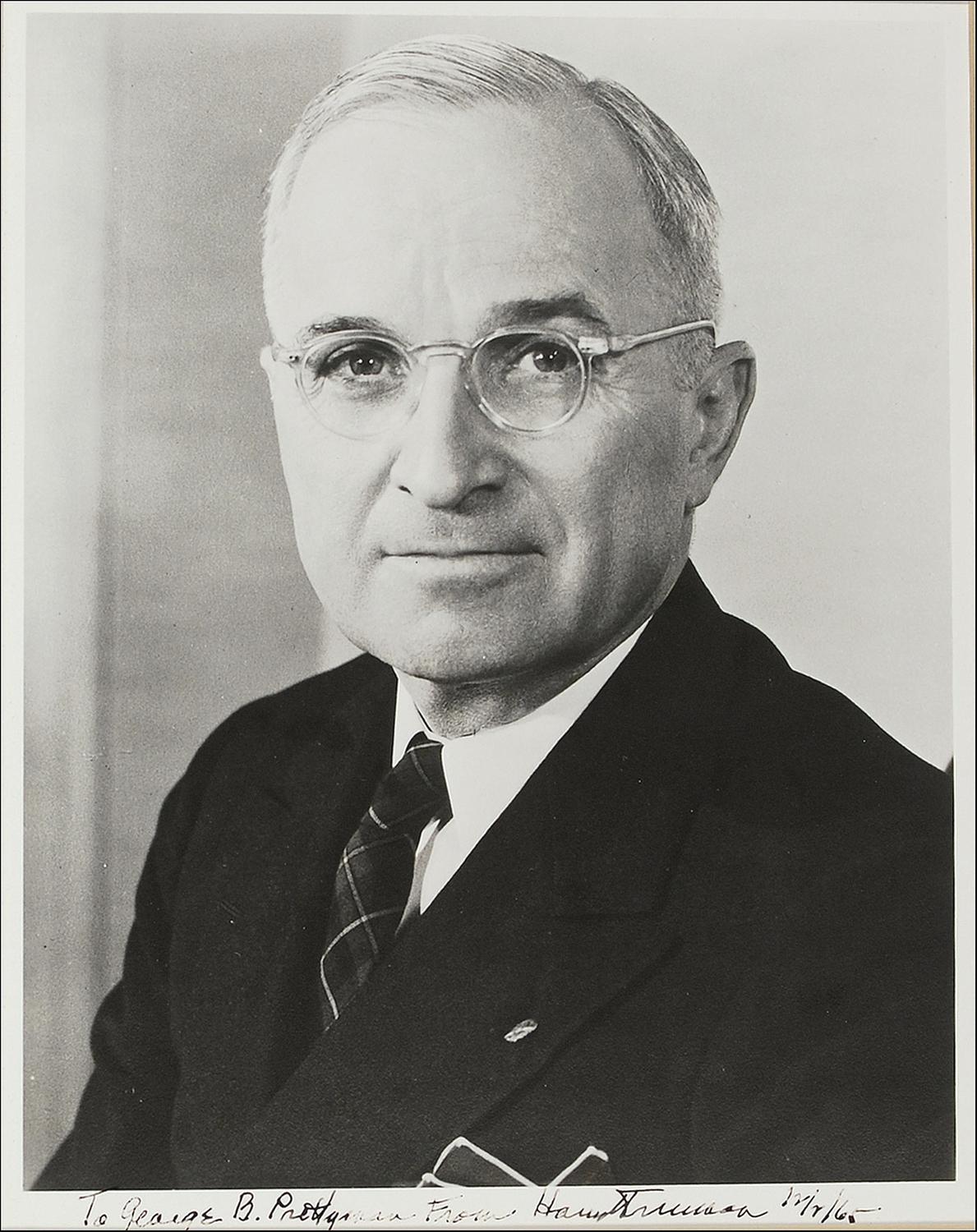 Vintage matte-finish 8 x 10 photo, signed and inscribed in black ink “To George B. Prettyman from Harry S. Truman 12/2/65.” Matted to an overall size of 11 x 13. In fine condition, with some skipping and irregular ink adhesion to inscription.
