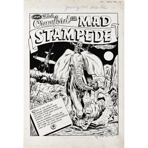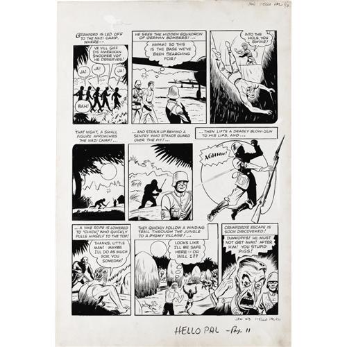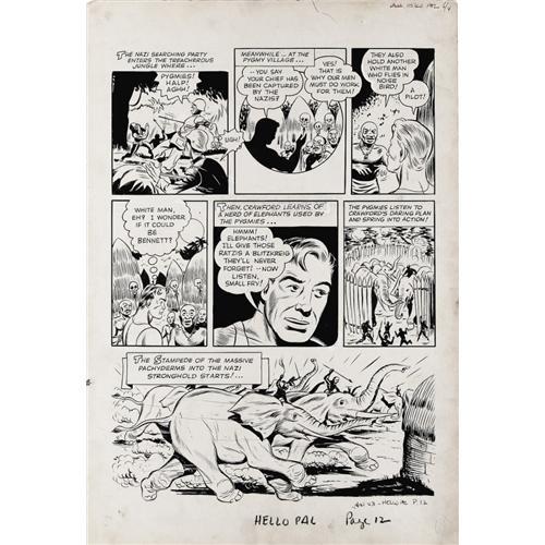 <B>Harry Sahle - Hello Pal Comics #1 Complete 6 -page Story "Lieutenant Chick Crawford and the Mad Stampede" Original Art (Harvey, 1943).</B></I> After his plane crashes on the shores of a Nazi-infested African jungle, can Lieutenant "Chick" Crawford possibly escape, or must he remain a prisoner of those sly and treacherous men of the Swastika? You'll discover the answer to those questions in this six-pager by Harry Sahle. Filled with rampaging pachyderms and a nasty Nazi commander with the prerequisite monocle, the story moves at a brisk pace with a hefty helping of jungle action. The image area of each page measures approximately 13" x 18". The logo has been partially recreated; otherwise, the art is in Excellent condition. <BR><BR><B>Important notice:</B> Heritage usually auctions material at the rate of 200-250 lots per hour. On some occasions eBay Live bid software or the Internet may not be able to keep up with the pace of the auction. We recommend placing a realistic absentee bid now as insurance to avoid disappointment. Occasionally the auctioneer may eliminate or reject an eBay Live bid, and the auctioneer may also reopen a lot after the close of the eBay live bidding (usually because we missed an audience bid), and may reject your bid even if it shows you as the winning bidder. By bidding via eBay Live, you agree that Heritage may award the lot to another bidder at its sole discretion under the circumstances described above or any other reasonable circumstances. Since eBay bids are not shown to us until we open the lot on the floor, we treat those bids just like floor bids. In most cases the floor responds before the eBay bid is presented to us, due to Internet lag time, so for consistency we have made it a policy that floor bids are always considered first over tie eBay live bids. Also please note that all Heritage lots purchased through eBay Live carry a 22.5% Buyer's Premium. Please make sure you read the Terms and Conditions before you bid. This lot is being auctioned in conjunction with a live floor auction by Heritage Auction Galleries. All final auction and invoice information will be supplied by Heritage Auction Galleries, and all other information should be considered preliminary. Lot:41001 <BR><BR><B>Winning Notification and Billing:</B> After the FINAL session in this auction is complete, Heritage will send e-mail and snail mail invoices. This process normally takes several days. All final auction and invoice information will be supplied by Heritage Auction Galleries, and all other information should be considered preliminary. <BR><BR>This auction will be conducted on a live auction floor and over the Internet through eBay Live. If you choose to place an absentee bid, please take a moment to <font color='#0000ff'><u><a href='http://pages.ebay.com/liveauctions/help/before/laabsentee.html'>learn how eBay Live absentee bidding works</a></u></font><font color='#000000'>