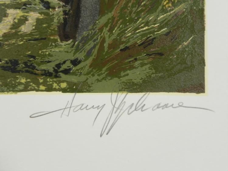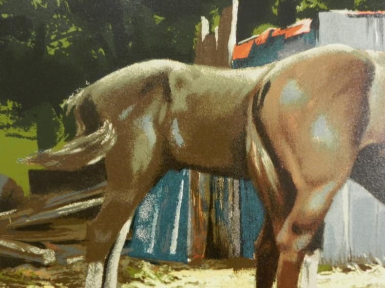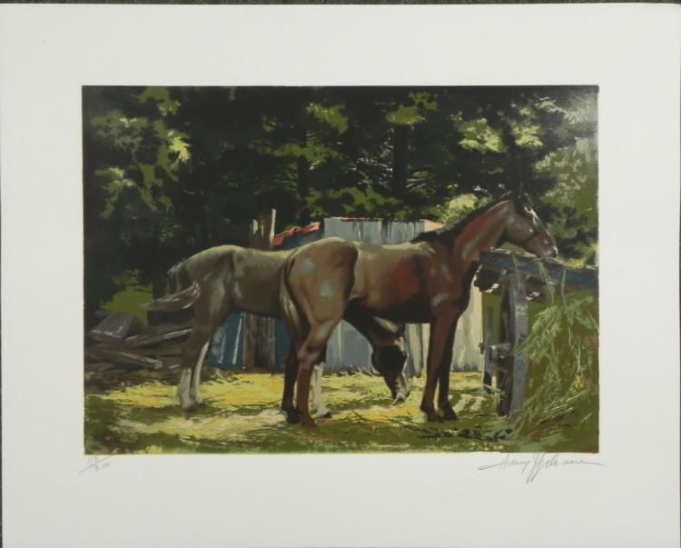 Artist: Harry * SchaareTitle: Horses * Medium: Litho on * paperSignature: Signed by artist, lower * rightEdition: 116/300, lower * leftImage size: 14" x 19 1/2" * Sheet size: 20 1/2" x 25 1/2" * Condition: Very good; minor crease to upper right corner that can be matted out * Biography * * Harry * Schaare * (1922 - ) is a * prolific artist for hard and softcover books * (Avon, HarperPaperbacks, Dell, Monarch, Popular Library, Pyramid, * Bantam, Signet, Readers Digest, Random House). Magazine work for * Saturday Evening Post, Boy's Life, Sports Illustrated, and various men's * adventure mags. Schaare was comfortable with just about any subject * matter, from noir stories to westerns, romance to suspense. Also called * upon for reprints buy famous authors (Rafael Sabatini, Philip K Dick, * Richard Henry Dana, Zane Grey, James Fenimore Cooper, Max Brand, Erskine * Caldwell). Other projects include box art for Aurora models and F X * Schmid puzzles. Most recent work for western, sail, and sports print * subjects. * * *Retrieved from: * http://www.americanartarchives.com/schaare,harry.htm *