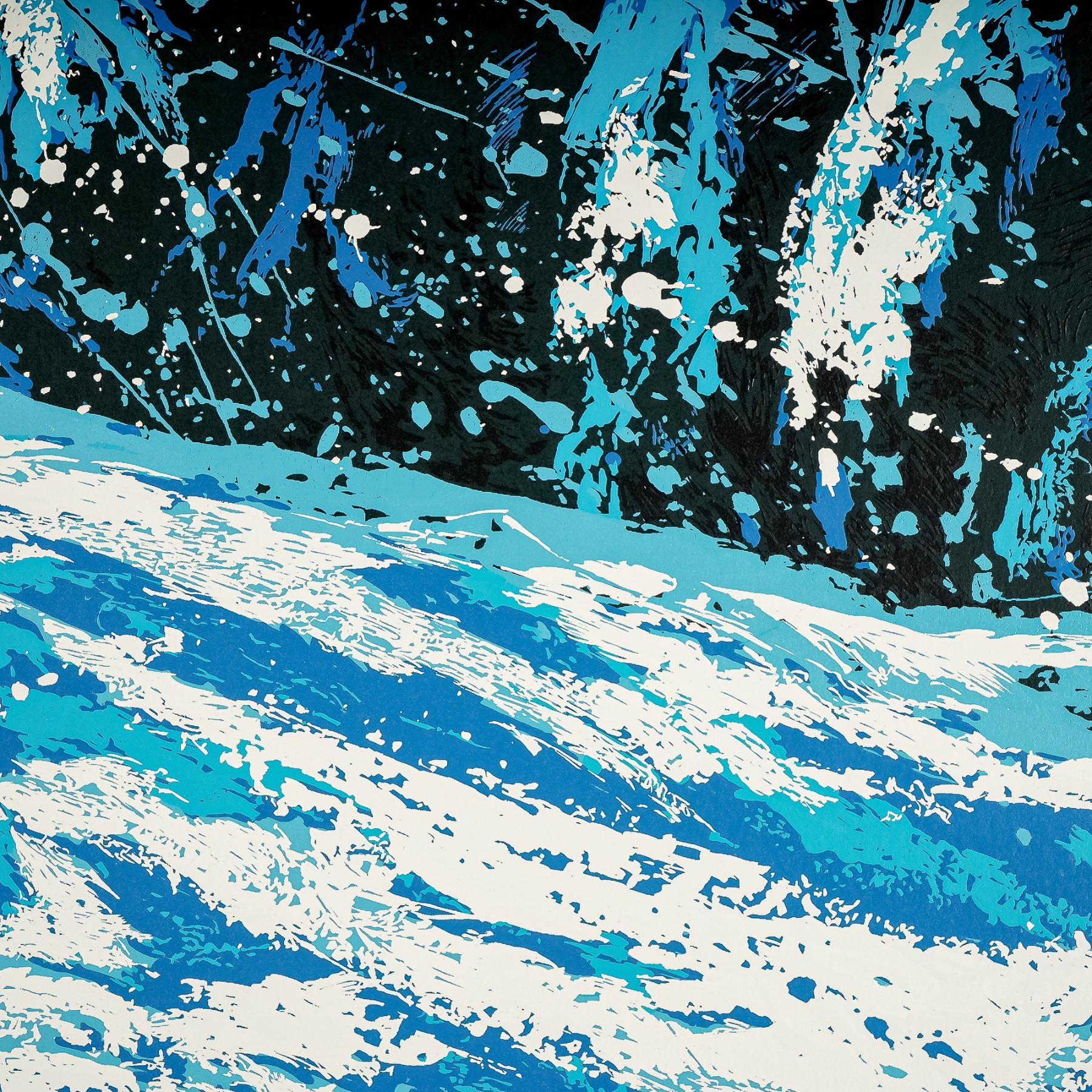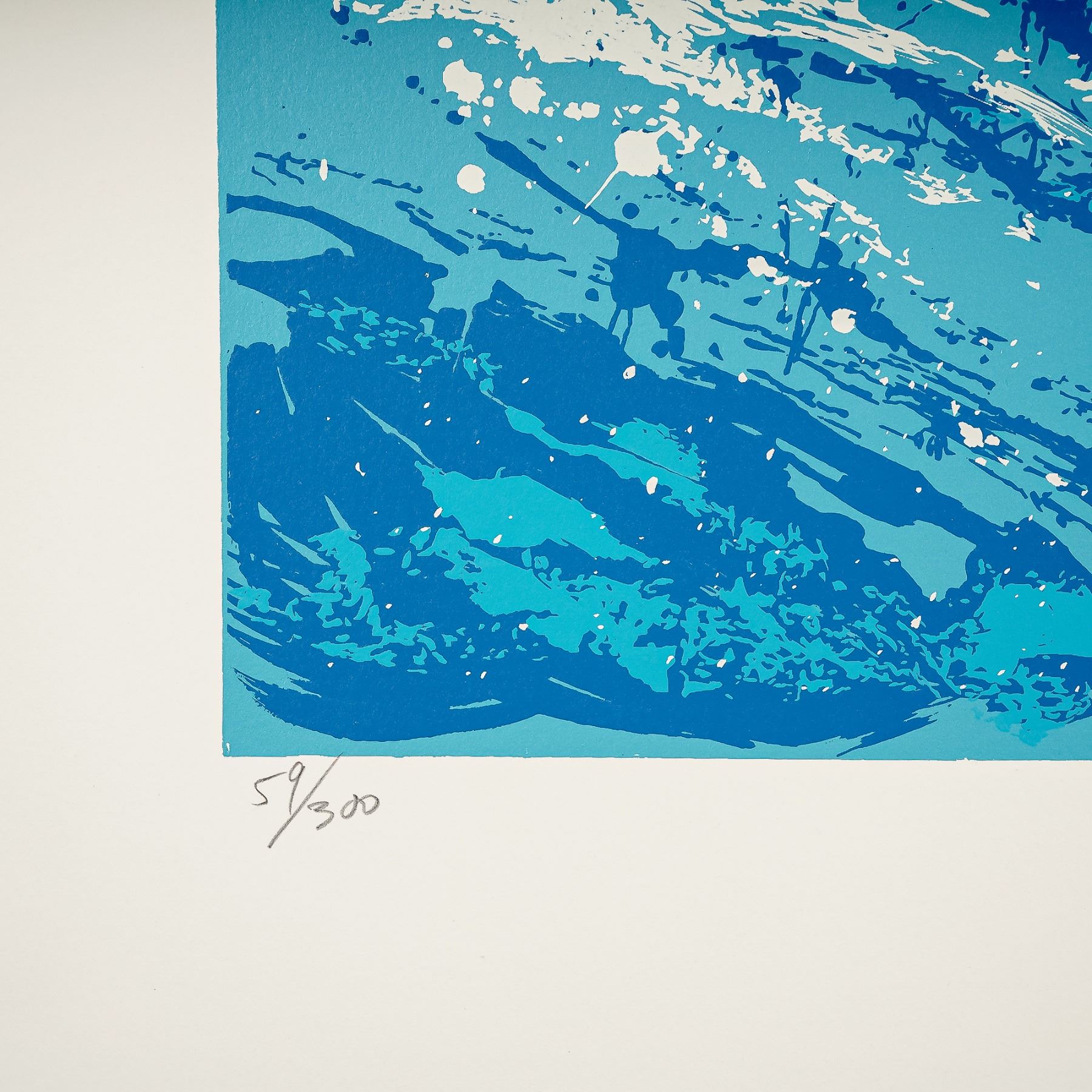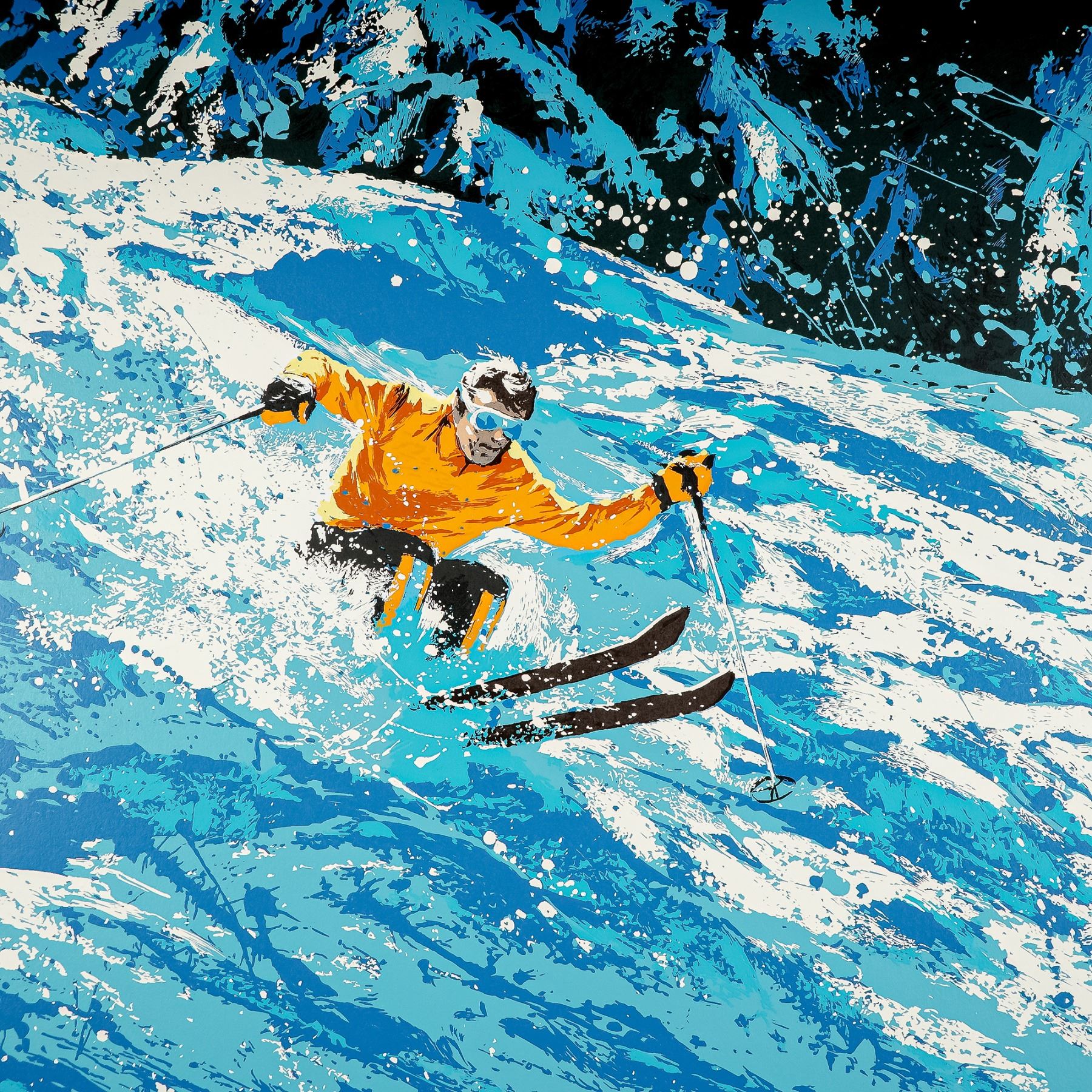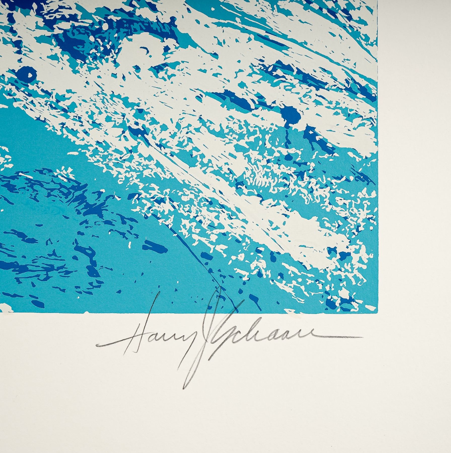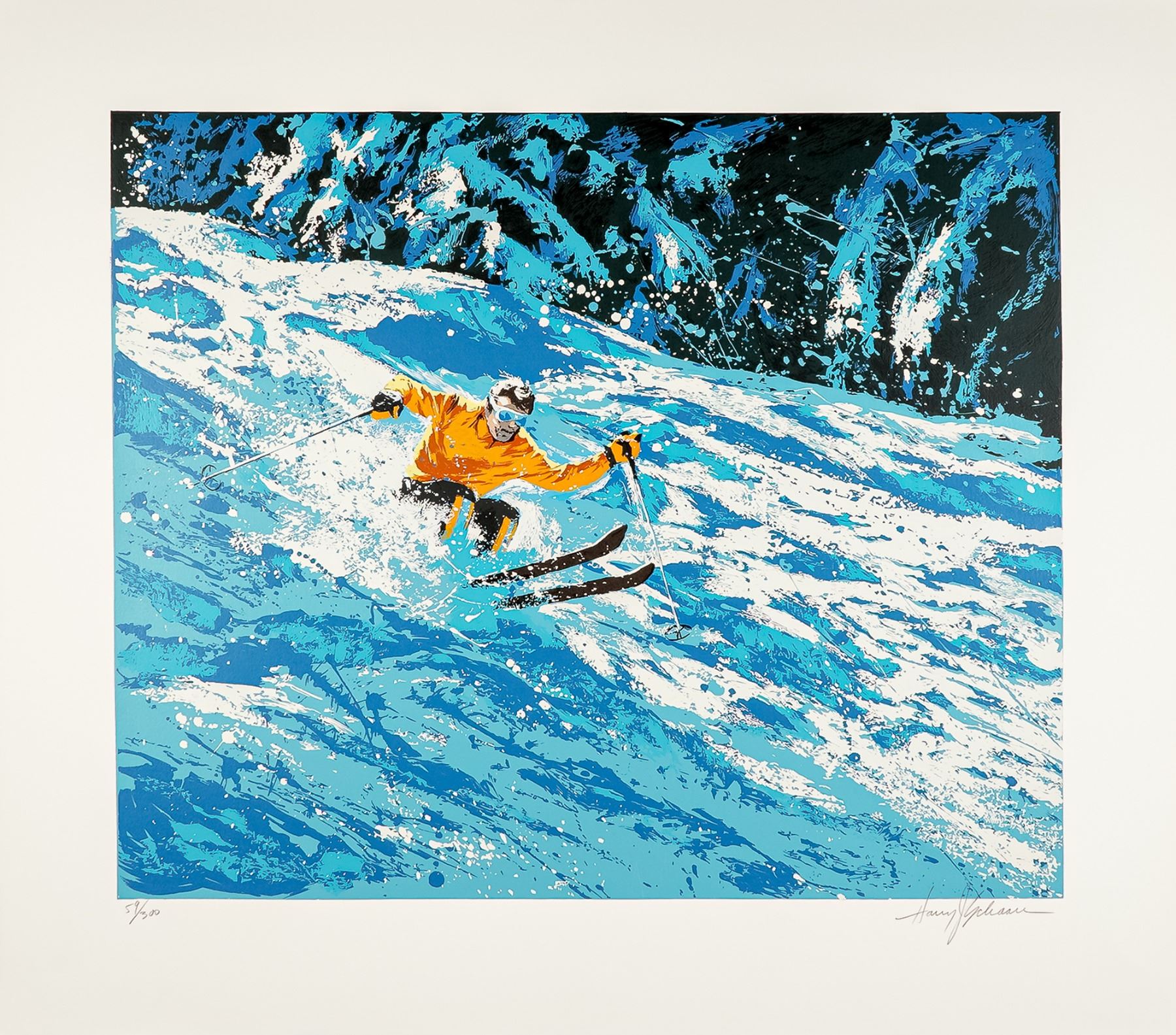 A dynamic serigraph on paper by acclaimed American artist Harry Schaare, capturing the thrill of alpine skiing with bold strokes and vivid contrast. The work depicts a skier in bright orange jacket carving down a snow-covered slope, surrounded by an explosion of blue and white tones that convey both motion and energy. This limited edition print highlights Schaare's talent for transforming action scenes into vibrant, modern compositions. A striking addition for collectors of sporting art and contemporary serigraphy. Numbered 59/300 and hand-signed by the artist in pencil at the lower margin.