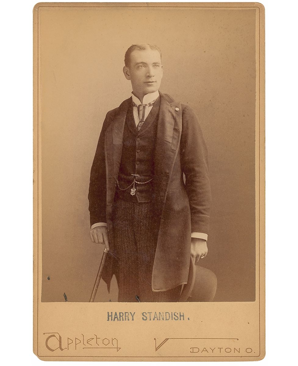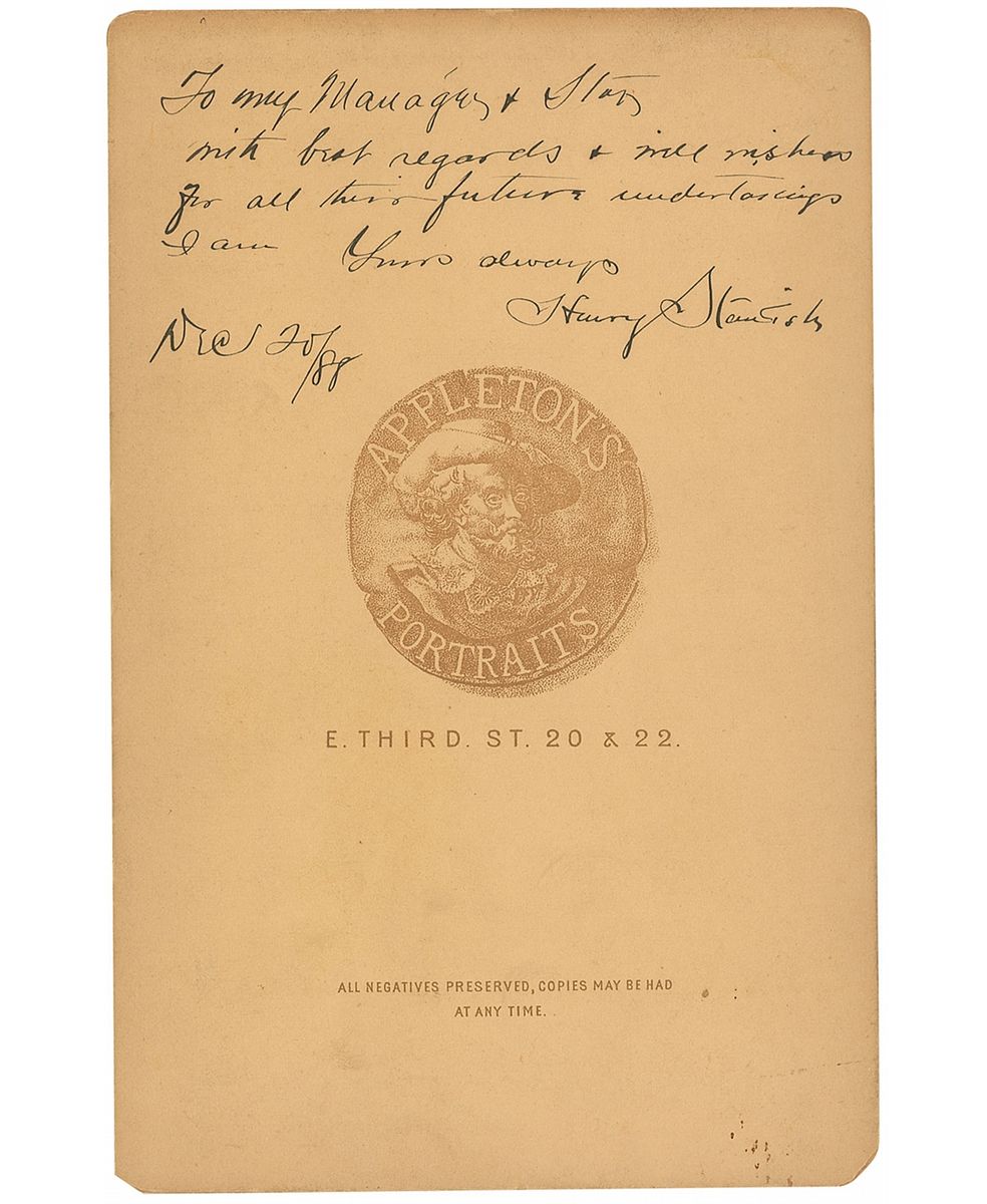 American singer who appeared with Lillian Russell in Patience and numerous other Broadway shows. Original 4.25 x 6.5 cabinet photo by Appleton of Dayton, Ohio, signed and inscribed on the reverse in black ink, “To my manager & staff, with best regards & well wishes for all their future undertakings. I am, yours always, Harry Standish, Dec. 20/88.” In fine condition, with overall toning and a light chip to the lower left corner.