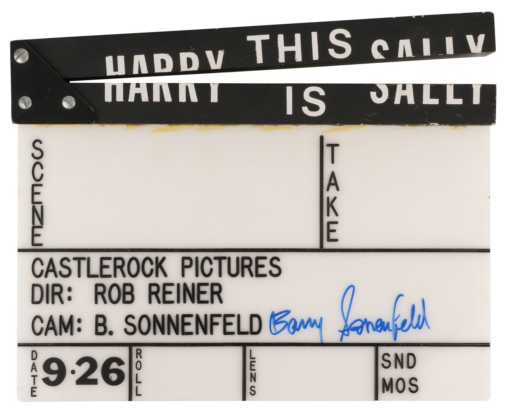 463. "Harry This is Sally" (When Harry Met Sally) clapperboard signed by Barry Sonnenfeld. (Columbia, 1989) Vintage original clapperboard measuring 9.5 x 12.5 in. with wooden clapsticks stenciled front and back in white, "Harry This Is Sally", and white plexiglass lower etched in black with various production information, signed in blue, "Barry Sonnenfeld". Exhibiting production wear. In very good condition. From the collection of Barry Sonnenfeld. $800 - $1,200