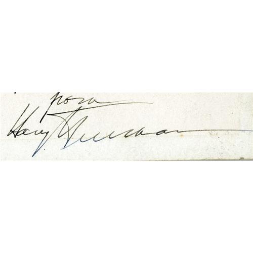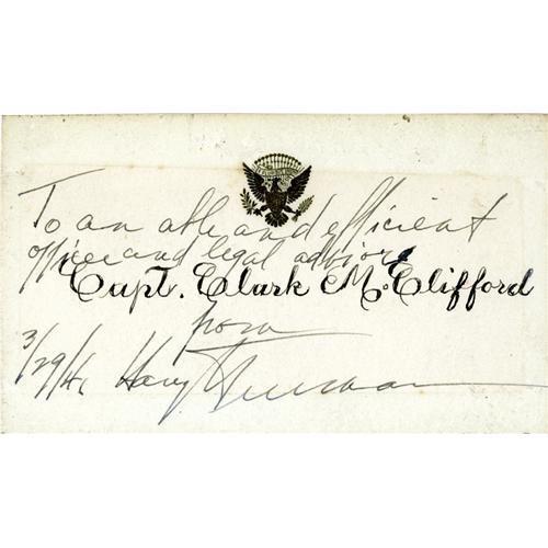 <B> Harry Truman Card To Clark M. Clifford Signed </B></I> <I> "To an able and efficient officer and legal advisor, Harry Truman, 3/29/41." </B></I> 4.25" x 2.5", with the presidential eagle printed on the top, on very sturdy paper, signed while he was a United States Senator representing Missouri. Clark Clifford was one of Truman's close advisors during his presidency. <BR><BR> The card is in very fine condition; light toning in the center of the card; localized soiling present on the obverse; signature is bold and dark!