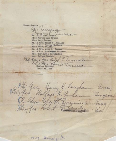 Harry Truman 1949 Inaugural guest list signed four times as President, with 10 guests added in handwriting by Truman, including his wife, daughter, and cousin, among others. He also corrects his brother-in-law's name, changing ''Frederick'' to ''Fred''. Over 30 words written in Truman's hand in dark, bold ink. Document, measuring 8'' x 9.75'' is matted and framed to an overall size of 13.5'' x 15.'' Creasing and toning throughout, with lower two corners cut off and some plastic tape at edges, else very good condition.