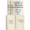 Harry Truman signed two-volume set of his memoirs, ''Years of Decisions'' and ''Years of Trial and Hope''. Doubleday: Garden City, NY: 1955 & 1956. Volume One is signed and inscribed on the fly-leaf in black ink, ''To Robert M. Bacon / Kind regards from / Harry S. Truman / 6-15-66''. Volume Two is again signed and inscribed on fly-leaf, ''Best wishes to / Robert M. Bacon / from / Harry Truman / 6-15-66''. Volume one runs 596pp; volume two runs 594pp. Each measures 5.5'' x 8.5''. Bound in black cloth boards with blue print and silver gilt lettering. Volume One shows pencil notations to the front free endpaper. Volume Two shows a shallow dent to the front board edge and pencil notation to front free endpaper, else near fine. Dustjackets are in very good condition with just a few minor tears to edges and shelf wear.
