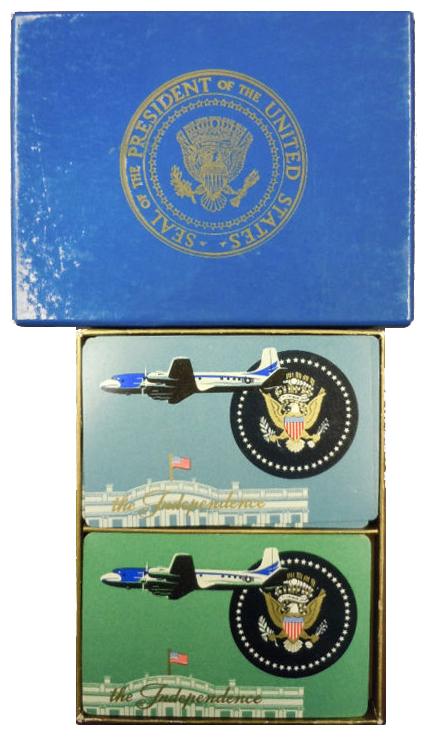 Harry Truman Presidential playing cards from his Air Force One plane, ''The Independence.'' Two full decks -- with each card featuring the plane, an impressive Presidential seal and portion of the White House depicted. A handwritten note on the inside of the box reads: ''These cards were used on President Truman's plane flying to Wake Island from Honolulu on the day of his visit with General MacArthur on October 15, 1950.'' Blue glossy box with minor scuffing measures 3.75'' x 5'' and individual cards measure 3.5'' x 2.25''. Near fine.