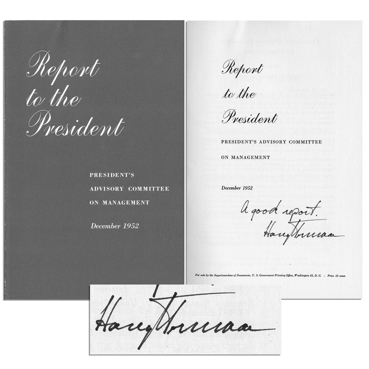 Harry Truman signed ''Report to the President / President's Advisory Committee on Management / December 1952''. Autograph note on the title page reads ''A good report. Harry Truman'', likely signed as President. Booklet printed by the U.S. Government Printing Office'' is noted as being ''For sale by the Superintendent of Documents'' for 15 cents. Measures 5.75'' x 9.25''. Near fine.