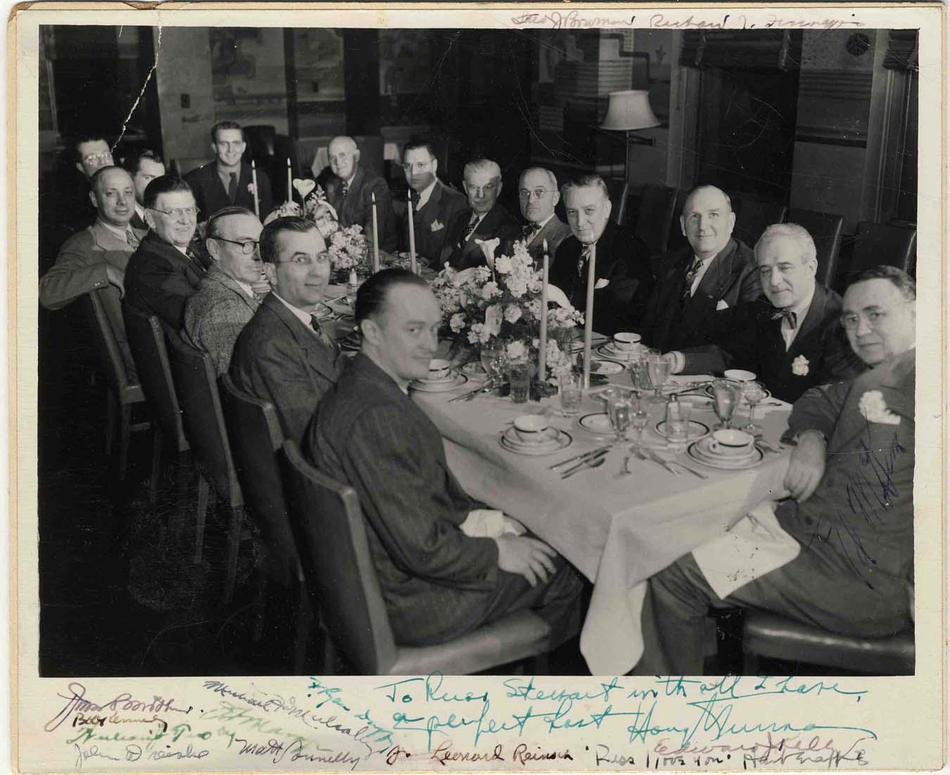 10'' x 8'' black and white photo of President Harry Truman inscribed in green ink, ''To Russ Stewart with all I have, a perfect host. Harry Truman.'' Russ Stewart was the Managing Editor of the Chicago Times. Other attendees and signers include Chicago Mayor ''Edward J. Kelly,'' Co-founder of the Chicago Times ''Richard J. Finnegan,'' FDR's Press Secretary ''J. Leonard Reinsch'' and Truman's Secretary ''Matt Connelly.'' Mounted to board of same size. Tear to upper left corner, light soiling and creasing. In good condition.