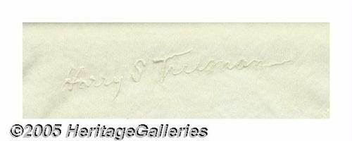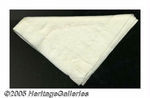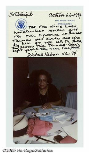 <B>Harry Truman Signature Design Linen Handkerchief</B></I> White House maid Wilma Holness served many Presidents during her time in Washington, D.C. Holness worked for Harry Truman during his entire time in the Oval Office, and was given various tokens of appreciation for her service. This fine white linen handkerchief is monogrammed with Truman's signature and was used by the President while in the White House. Holness reminisced about the Trumans and the provenance of the handkerchief on a White House card in her own hand. A photo of maid Wilma holding HST's monogrammed hankie is also included. Lot:254