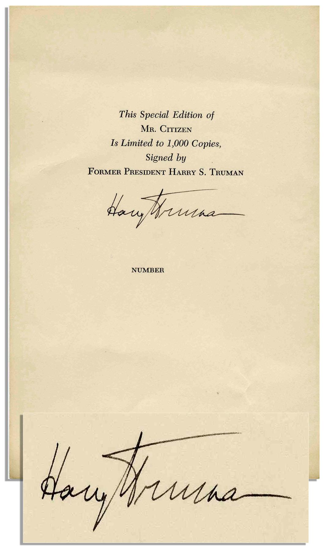 Bold, clear Harry Truman signature on a special edition page of his 1960 book, ''Mr. Citizen.'' Sheet was signed in advance of the book's publication to be tipped in at a later date, though never used, as the limited edition ''Number'' is left blank. Reads: ''This Special Edition of Mr. Citizen is Limited to 1,000 Copies, Signed by Former President Harry S. Truman'' and is signed boldly in black ink ''Harry Truman''. Sheet measures 6'' x 9.25'' and has minor toning throughout and one very minor crease, else fine condition.