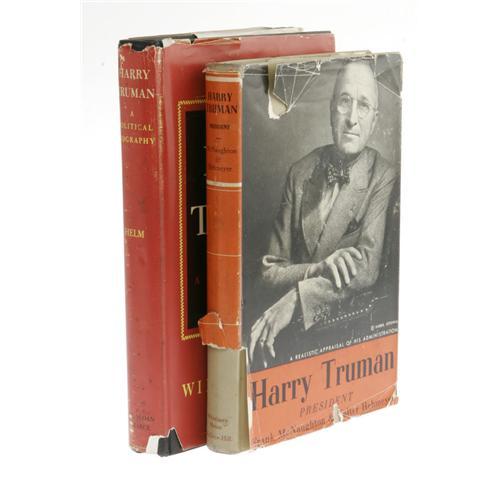 <B>Harry Truman Signed Biographies with His Comments.</B></I> Two books in this lot. <I>Harry Truman: A Political Biography</B></I> by William P. Helm (New York: Duell, Sloan and Pearce, 1947), first edition, vii, 241 pages, black boards with red titles, 8vo (6" x 8.75"), dust jacket, signed on the front free endpaper "<I>This is not very accurate! Harry Truman Independence Oct. 26, 1954</B></I>". Book in very good condition, scuffed at the top edge, corners bumped. The dust jacket has multiple rips and tears. <BR><BR><I>Harry Truman President A Realistic Appraisal of His Administration</B></I> by Frank McNaughton and Walter Hehmeyer (New York and Toronto: Whittlesey House, McGraw-Hill Book Company, Inc., 1948), first edition, 294 pages, tan cloth boards, 8vo (5.75" x 8.25"), dust jacket, signed on the front free endpaper "<I>This one is better than Bill Helm's HST Independence Oct. 26, 1954</B></I>" and on the frontispiece photo "<I>Harry Truman</B></I>". Book is very good condition, spine and back cover soiled where dust jacket is ripped, corners bumped. Dust jacket is poor condition with a portion missing. From the Henry E. Luhrs Collection.