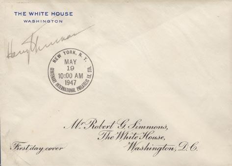 Harry Truman signed and addressed White House envelope, dated 19 May 1947. Nice ''Harry S. Truman'' signature at upper left. Addressed in calligraphy to ''Mr. Robert G. Simmons / The White House / Washington, D.C.'', envelope measures 6.75'' x 4.75'' with noted ''First day cover'' at lower left. Narrow plastic tape mounting strip along top edge, else near fine condition.