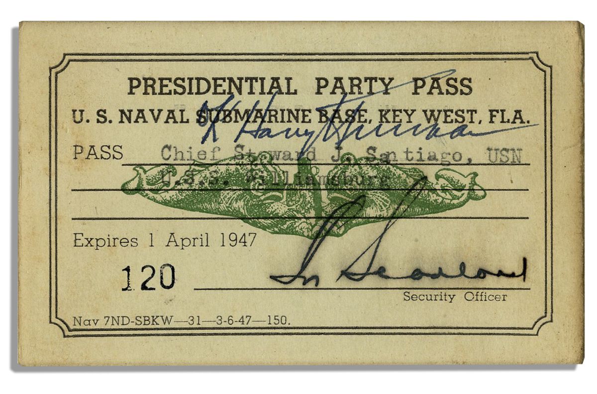 President Harry Truman signed naval card. Reads: ''Presidential Party Pass / U.S. Naval Submarine Base, Key West, FLA. / Pass: Chief Steward J. Santiago, USN / U.S.S. Williamsburg / Expires 1 April 1947''. Signed by Truman in blue ink across type, ''Harry Truman''. Measures 3.75'' x 2.5'' and is in very good condition.