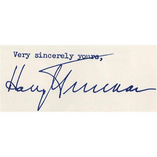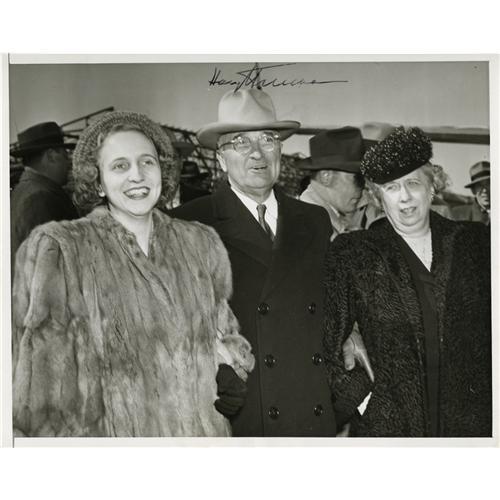 <B>Harry Truman Signed Photo.</B></I> The photo is a 9" x 7" B&W press photo picturing Truman with his wife Bess and daughter Margaret, signed only by him. Included with this lot are several typed letters from Truman which contain printed and secretarial signatures. One of them is from his last days as Senator. <BR><BR>The photograph is in very fine condition. Accompanied by LOA from PSA/DNA. <BR><BR><B>Important notic