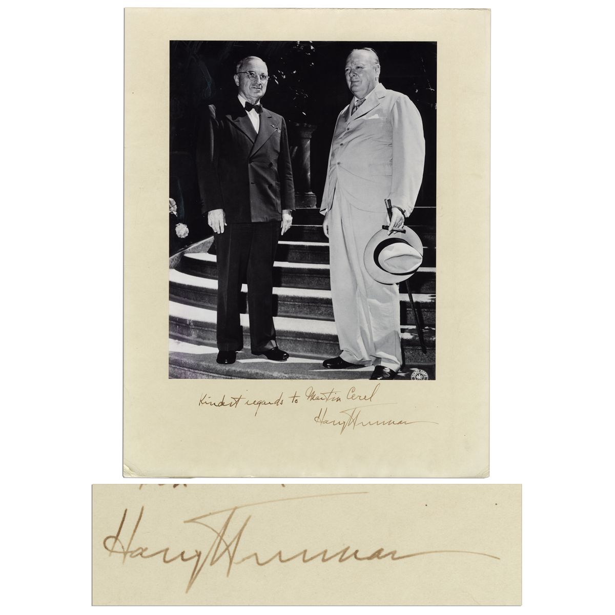 Harry Truman photo display signed. Image of Truman and Winston Churchill is mounted to a mat inscribed by Truman, ''Kindest regards to Martin Cerel / Harry Truman''. Photo measures 8'' x 10'', with signed mat 11'' x 14''. Light toning and ever so slight buckling to bottom edge, else near fine. Pre-certified.