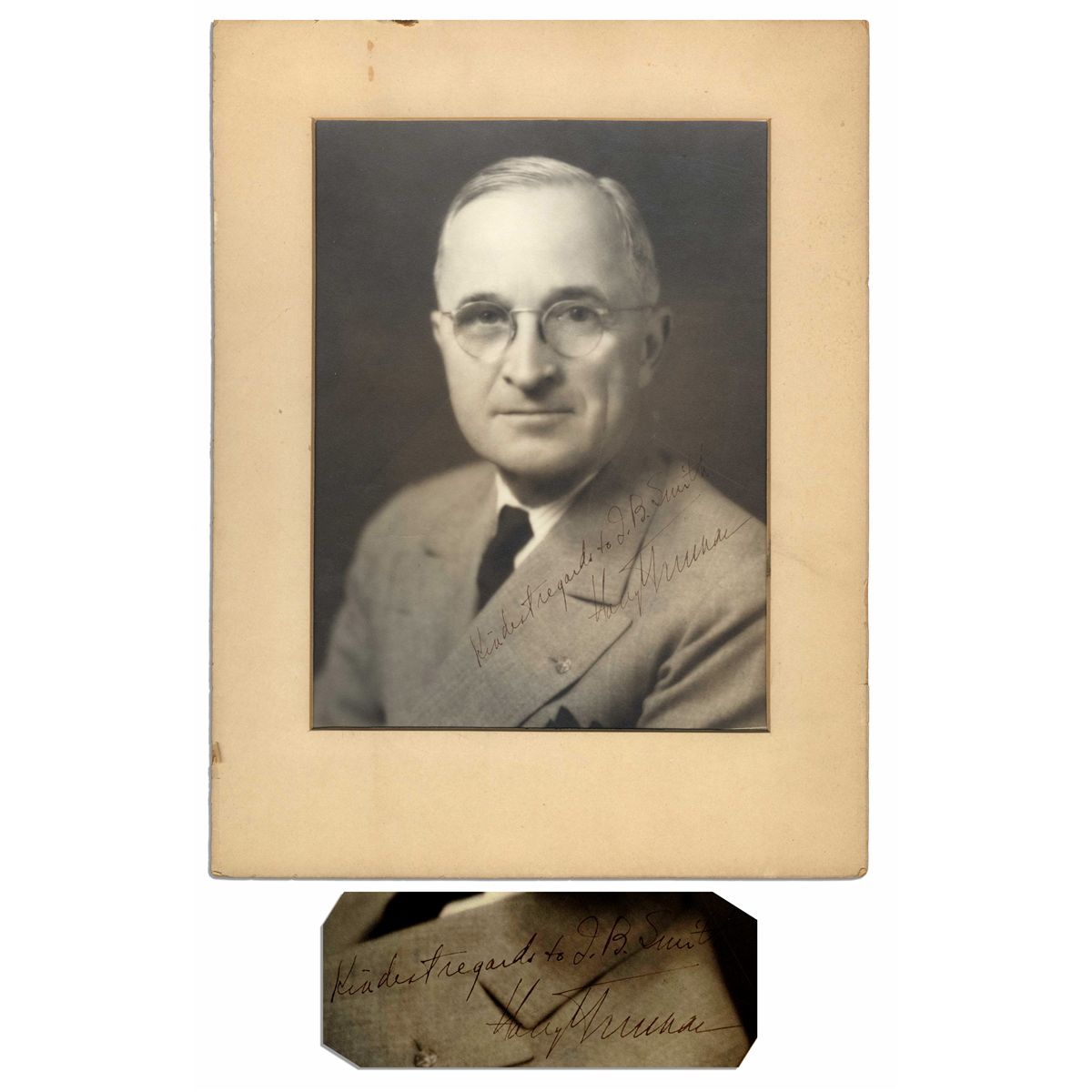 Harry Truman signed 8'' x 10'' matte photo. Inscribed: ''Kindest regards to J.B. Smith / Harry Truman''. Sepia photo with Chase-Statler, Washington, D.C. copyright is affixed to cardboard and matted to an overall size of 10'' x 13''. Minor chipping to cream colored mat, else very good. Photo is in near fine condition.