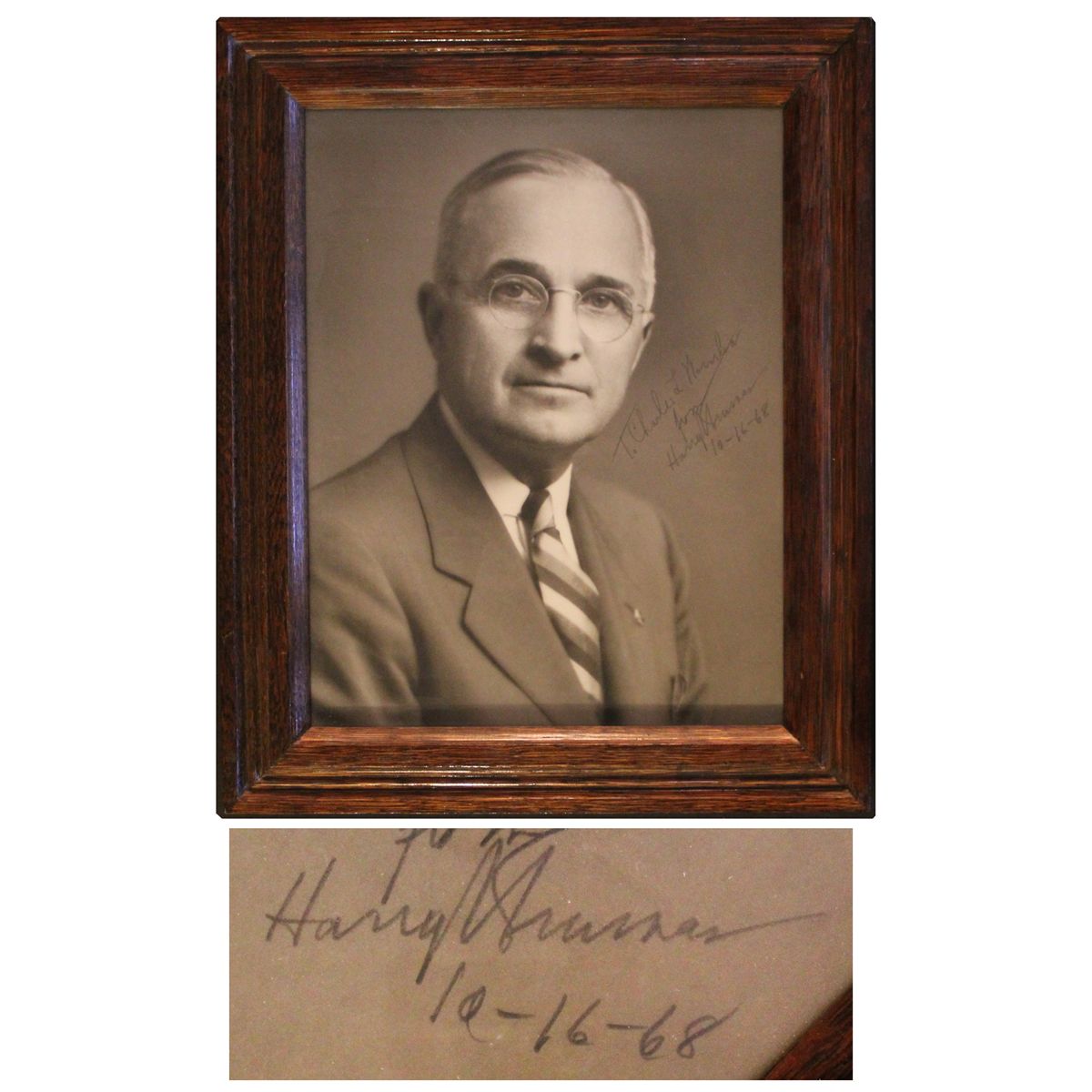 Impressive Harry Truman signed oversized photo. Inscribed in black ink: ''To Charles L. Worilson From Harry Truman 10-16-68''. Black and white photo measures 10.5'' x 13.5'' and is framed to an overall size of 14'' x 17''. Near fine condition.
