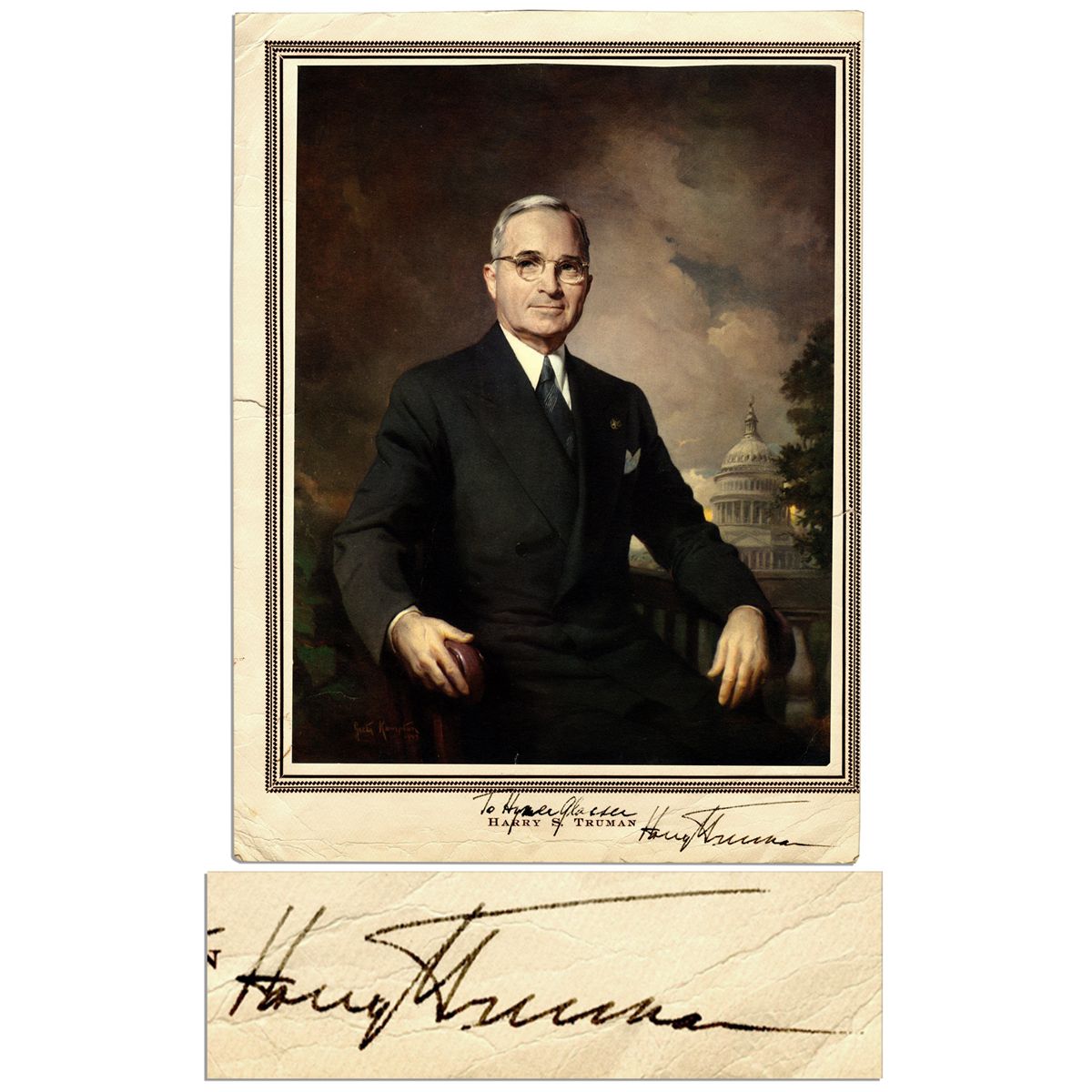 Harry Truman signed portrait, from the program for a 1957 Miami Beach luncheon to raise funds for his Truman Library. Inscribed in black ink, ''To Hyman Glasser / Harry Truman''. Portrait on thick card stock measures 9.75'' x 13'', with information about the event on the verso. Moderate creasing, small tear along left edge and small amount of handwriting on verso. Overall very good.