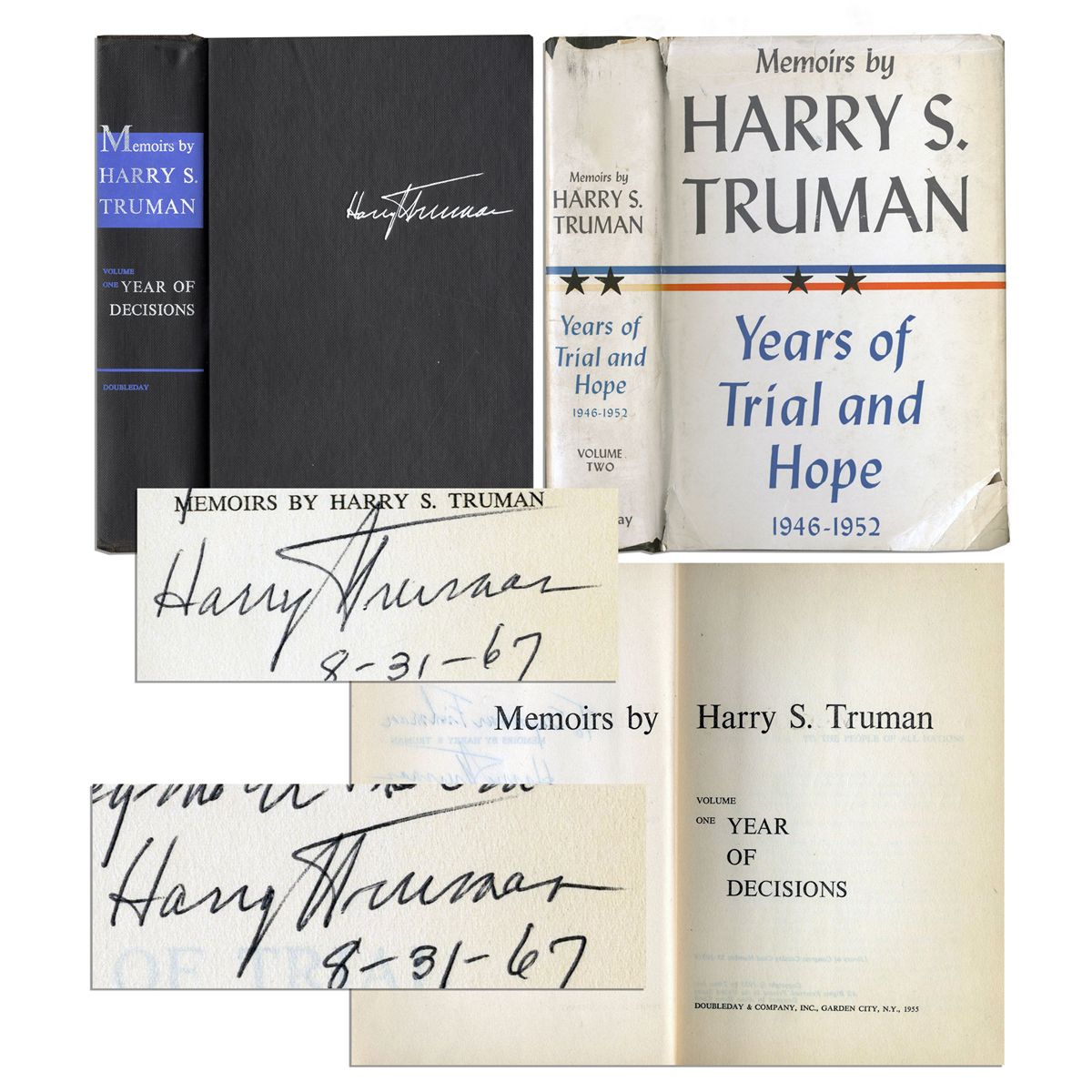 ''Memoirs by Harry S. Truman'' two volume set published in 1955 by Doubleday & Co., Garden City, NY. ''Year of Decisions'' and ''Year of Trial and Hope'' are both signed on the half-title page, ''Harry Truman'' and inscribed ''To Seymour Fishman / 8-31-67''. Black hardcover books with silver and blue lettering are in very good condition. No dustjacket for volume one. Dustjacket of Volume two has moderate tears at edges. Overall a very nice, presentable set, unusually signed in each volume.