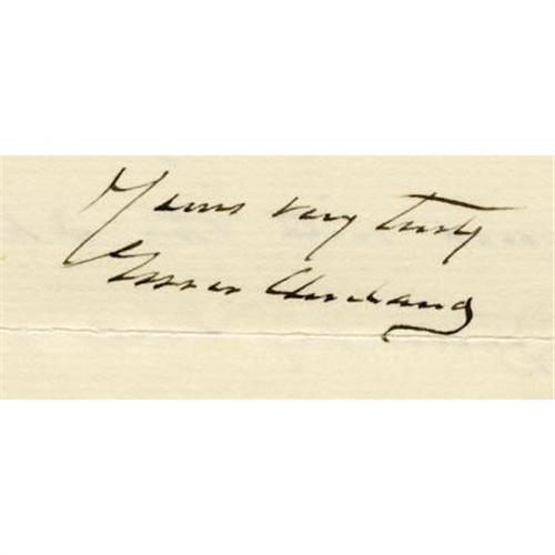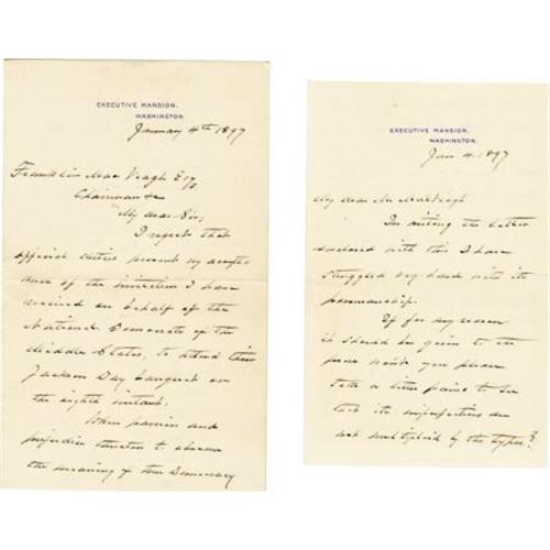 <B>Harry S. Truman Typed Letter Signed and Two Grover Cleveland Autograph Letters Signed.</B></I> In March 1952, Robert O. McNiel of Roanoke, Virginia, sent to President Harry S. Truman a January 4, 1897, autograph letter by President Grover Cleveland for his review. This lot includes Truman’s response to McNiel and <I>two</B></I> January 4, 1897, Cleveland letters: <BR><B>Truman TLS</B></I> One page, 6.75” x 8.75”, White House letterhead, March 13, 1952. Truman sent his reply to McNiel from the U.S. Naval Station in Key West, Florida. He writes in full: <I>“Dear Mr. McNiel: Accept my hearty thanks for your thoughtful letter of March 3rd. I found the text of that letter written by former President Cleveland on January 4, 1897 very interesting. I can well understand that it is a treasured part of your Presidential autograph collection. Very sincerely yours, </B></I> signed <I>Harry Truman”</B></I> The letter is accompanied by the original White House envelope. The letter is in fine condition with one fold; the envelope is near fine with no tears and some slight creasing at the top. <BR><B>Cleveland ALS</B></I> Three pages, 4.75” x 7.75”, Executive Mansion letterhead, January 4, 1897. Grover Cleveland (1837-1908), the 22nd and 24th President, was in the final months of his second presidency (1893-1897) when he wrote this letter to Franklin MacVeagh of Chicago, in response to an invitation to the Jackson Day banquet held by the National Democrats of the Middle States. He concludes the letter <I>“Yours very truly / Grover Cleveland” </B></I>The letter is in near fine condition with one fold and some very light soiling.<BR><B>Cleveland ALS</B></I> Two pages, 4.5” x 7”, Executive Mansion letterhead, January 4, 1897. Cleveland, who was having problems with his writing hand, penned a second letter to Franklin MacVeagh the same day, apologizing for his poor penmanship and requesting that he be careful with the first letter should it be given to the press. The letter is in near fine condition with one fold and some very light soiling. He again concludes his letter <I>“Yours very truly / Grover Cleveland”</B></I> The original envelope, in very good condition with some soiling and acidification, accompanies the Cleveland letters.<BR><BR><b>Shipping:</b> Flat Material, Small (<a target="_blank" href="http://www.heritageauctions.com/common/shipping.php">view shipping information</a>)