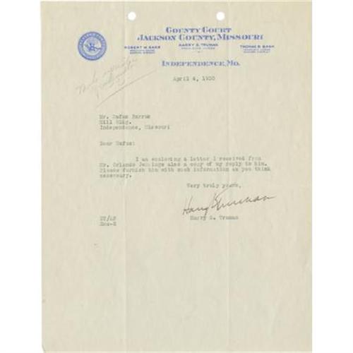 <B>Harry Truman Typed Letter Signed as Presiding Judge of Jackson County, Missouri</B></I> “<I>Harry S. Truman</B></I>”. One page, 8.5” x 11”, on Jackson County Court letterhead, Independence, Missouri, April 4, 1930, to Mr. Rufus Burrus. The letter reads: “I am enclosing a letter I received from Mr. Orlando Jennings also a copy of my reply to him. Please furnish him with such information as you think necessary.” With two filing holes at top, toned, with the usual fold creases, original penciled notes at top, else very good. <BR><BR><BR><b>Shipping:</b> Flat Material, Small (<a target="_blank" href="http://www.heritageauctions.com/common/shipping.php">view shipping information</a>)