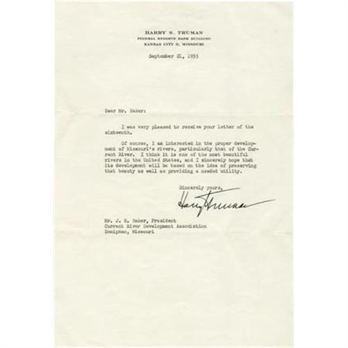 <B>Harry Truman Typed Letter Signed</B></I> “<I>Harry Truman</B></I>”. One page, 7.25” x 10.5”, on his personal letterhead, Kansas City, Missouri, September 21, 1955, to Mr. J. R. Baker, with the original transmittal envelope. Truman writes to Baker, President of the Current River Development Association. It reads in part: “…I am interested in the proper development of Missouri's rivers, particularly that of the Current River. I think it is one of the most beautiful rivers in the United States, and I sincerely hope that its development will be based on the idea of preserving that beauty as well as providing a needed utility…” With the usual fold creases, else a fine, bold signature. <BR><BR><b>Shipping:</b> Flat Material, Small (<a target="_blank" href="http://www.heritageauctions.com/common/shipping.php">view shipping information</a>)