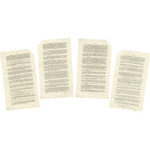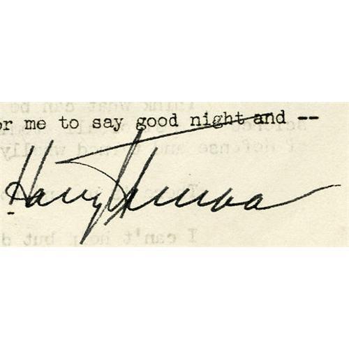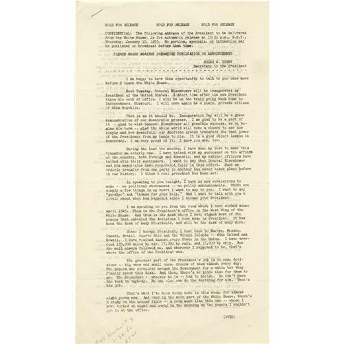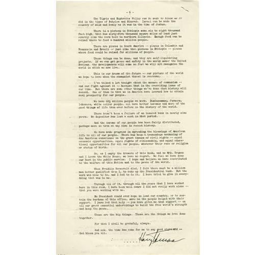 <B> President Harry Truman's Final Report to the Nation Signed </B></I> <I> "Harry Truman." </B></I> Six pages, 8" x 14", White House, Washington D.C., delivered at 10:30 Eastern, Thursday, January 15th, 1953. This mimeographed manuscript was a copy of the speech Truman gave in his last week in office. It reads in part, <I> "…Next Tuesday, General Eisenhower will be inaugurated as President of the United States. A short time after the new President takes his oath of office, I will be on the train going back home to Independence, Missouri. I will once again be a plain, private citizen of this Republic…The greatest part of the President's job is to make decisions-big ones and small ones, dozens of them almost every day. The papers may circulate around the Government for a while but they finally reach his desk. And then, there's no place else for them to go. The President-whoever he is-has to decide. He can't pass the buck to anybody. No one else can do the deciding for him. That's his job…I suppose that history will remember my term in office as the years when the "cold war" began to overshadow our lives. I have had hardly a day in office that has not been dominated by this all-embracing-struggle- this conflict between those who love freedom and those who would lead the world back into slavery and darkness. And always in the background there has been the atomic bomb…" </B></I> This document is full of historical allusion and memories of the Truman term. A truly handsome Truman document. <r The manuscript is in very fine condition; the usual folds are present. From the Henry E. Luhrs Collection. Accompanied by LOA from PSA/DNA.