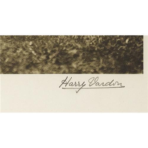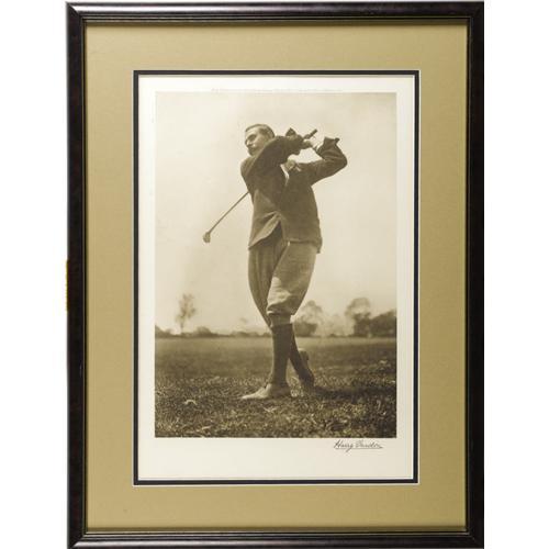 <B>1930's Harry Vardon Signed Oversized Photograph.</B></I> Blurring the lines between fine art and sports collectibles is this mesmerizing image of the early British Champion, snapped in 1905 and reprinted in the early 1930's, when Vardon applied his 10/10 pencil signature at lower right. The result is an elegant and tremendously scarce artifact that would elevate any fine golf collection to an elite level. Vardon, of course, popularized the grip that bears his name, and which is used by ninety percent of golfers to this day. He ranks as the greatest links legend of the turn-of-the-century, having won seven Majors between 1896 and 1914. Despite Vardon's tremendous relevance to the game, only a tiny handful of his autographs are known to exist, and none could possibly compare to the boldness of this one, or its placement on such a gorgeous medium. The print measures 13x19", and is appropriately matted and framed to a museum quality 19x25". Mint condition. <I>LOA from PSA/DNA.</B></I>