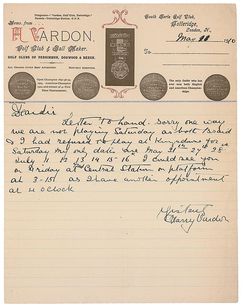 Golfer from the Bailiwick of Jersey (1870–1937) who won The Open Championship six times. He is a member of golf’s fabled ‘Great Triumvirate,’ along with John Henry Taylor and James Braid. Rare ALS, one page, lightly-lined, 8 x 10.5, Vardon’s business letterhead, May 28, 1910. Letter to a gentleman, in part: “Sorry one way we are not playing Saturday as both Braid & I had refused to play at Kingsdowne [sic] for Saturday.” Central vertical and horizontal folds with slight edge separations, otherwise fine condition. The only handwritten Vardon letter we have ever offered.