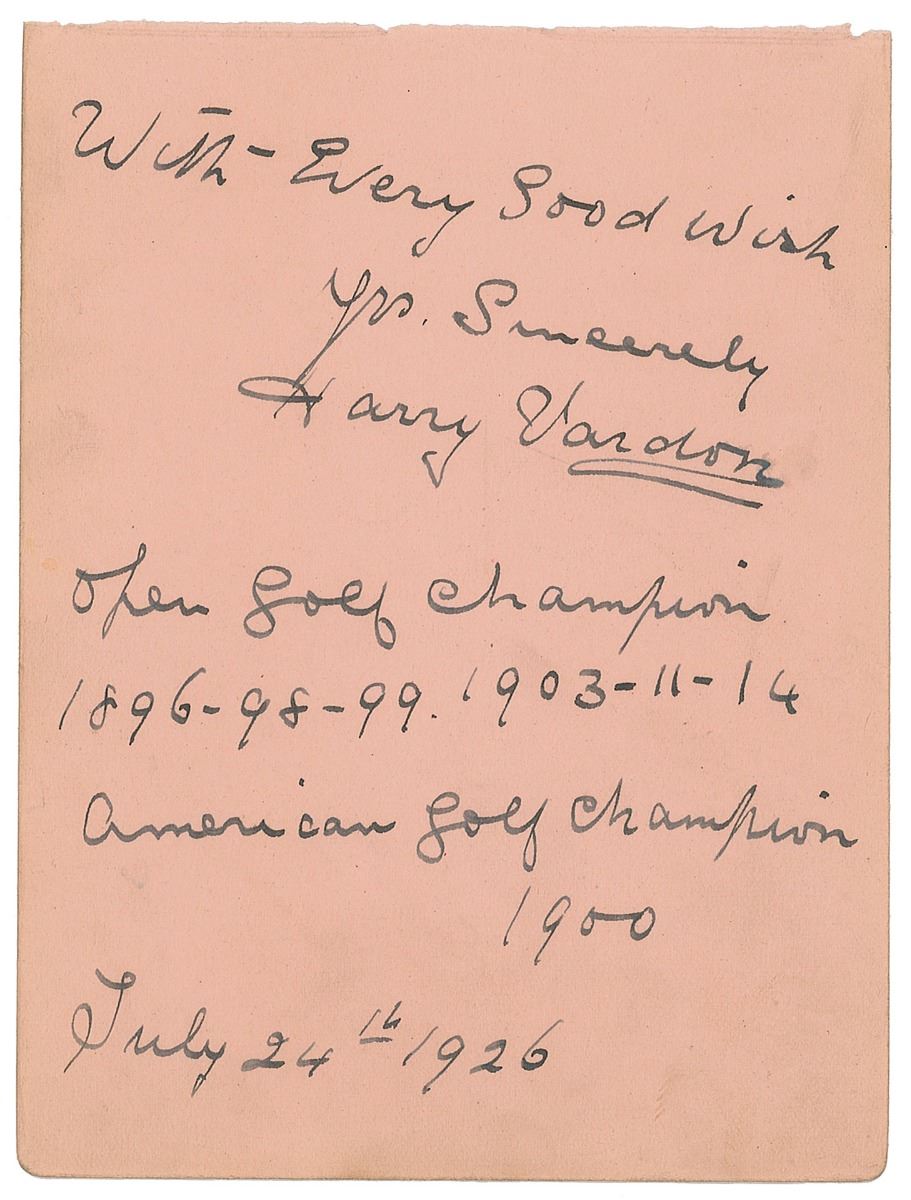 Golfer from the Bailiwick of Jersey (1870–1937) who won The Open Championship six times. He is a member of golf’s fabled ‘Great Triumvirate,’ along with John Henry Taylor and James Braid. Ink signature, “With every good wish, yrs. sincerely, Harry Vardon, Open golf champion, 1896–98–99, 1903–11–14, American golf champion, 1900, July 24th, 1926,” on a light pink 4 x 5.5 album page. In fine condition.