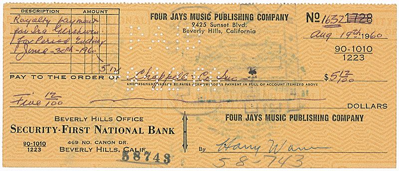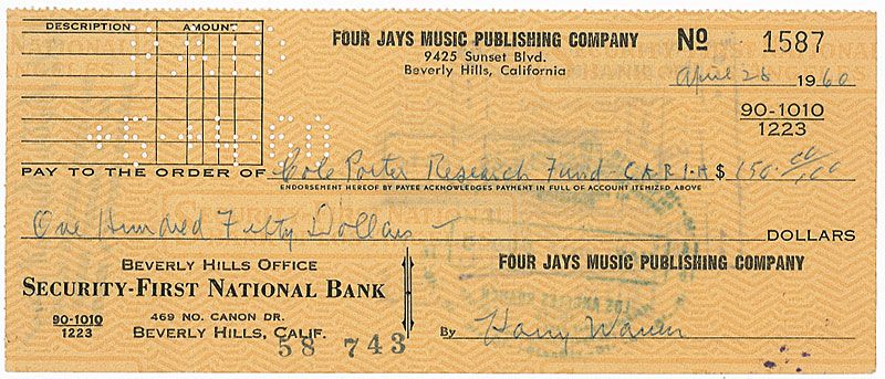 American composer and lyricist (1893–1981) nominated for the Academy Award for Best Song eleven times, winning thrice. Two Four Jays Music Publishing Company business checks, both 7.25 x 3, both from 1960. First is filled out and signed by Warren, payable to the Cole Porter Research Fund for $150.00, April 26, 1960. Second is filled out in another hand and signed by Warren, payable to Chappell & Co. for $5.12, August 19, 1960, with a memo reading, “Royalty payment for Ira Gershwin for period ending June 30th 1960.” In overall fine condition, with expected bank stamps and cancellation holes.