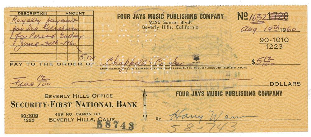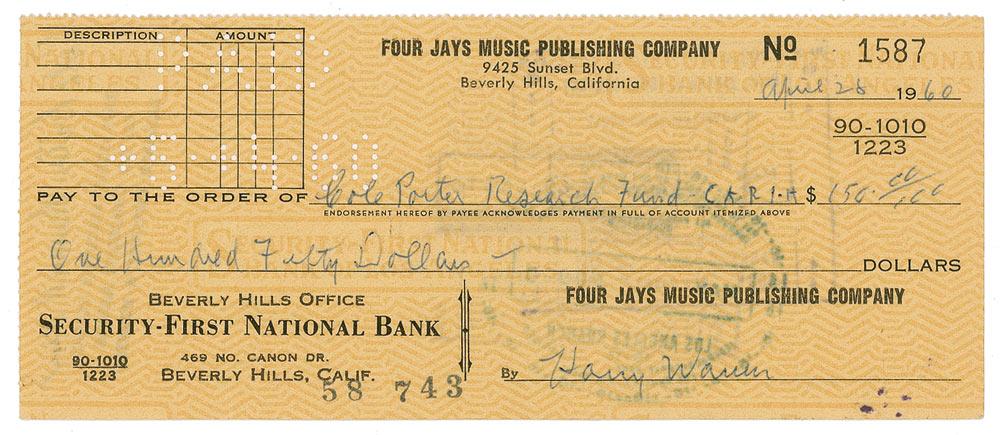 American composer and lyricist (1893-1981). He was nominated for the Academy Award for Best Song eleven times and won three Oscars. He wrote the music for the first blockbuster film musical, 42nd Street. Two Four Jays Music Publishing Company business checks, both 7.25 x 3, both from 1960, and both filled out in another hand and signed by Warren. One check is made out to the Cole Porter Research Fund, and the other to Chappell and Co., with memo stating “royalty payment for Ira Gershwin.” Expected stamps and holes, with light show-through from stamps under signatures, a vertical fold to one, and a pencil notation under one signature, otherwise fine condition.