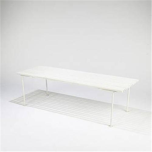 Harry Weese<BR>slat bench<BR>USA, c. 1955<BR>lacquered birch, enameled steel<BR>58"w x 19.75"d x 16.75"h<BR>Literature: Baldwin Kingrey: Midcentury Modern in Chicago 1947-1959, Brunetti, ppg. 58-59<BR>Provenance: Estate of Kitty Baldwin Weese, Chicago<BR><BR><BR><BR><BR>