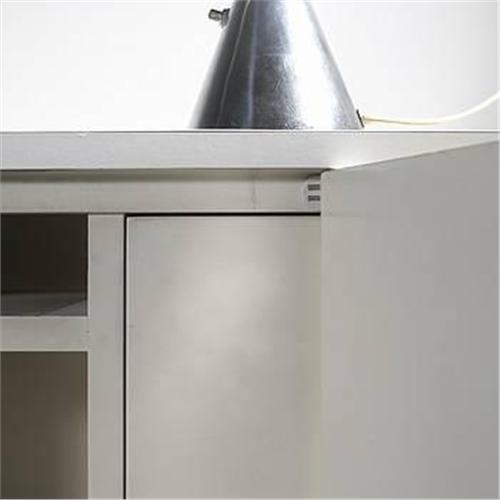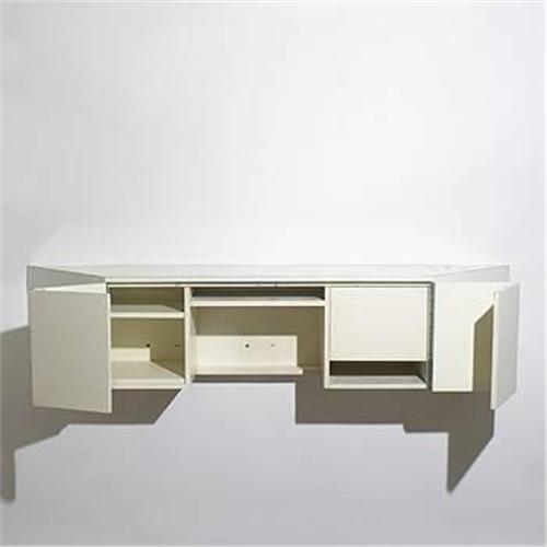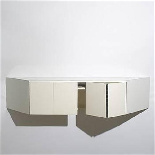 Harry Weese<BR>wall mounted desk<BR>USA, c. 1955<BR>lacquered wood, laminate<BR>78"w x 15"d x 17"h<BR>This custom designed wall unit was installed in the Weese residence. One door conceals two adjustable shelves, second door conceals file drawer. Opening for a chair in the middle revealed when both doors are opened.<BR>Provenance: Estate of Kitty Baldwin Weese, Chicago<BR><BR><BR><BR><BR>