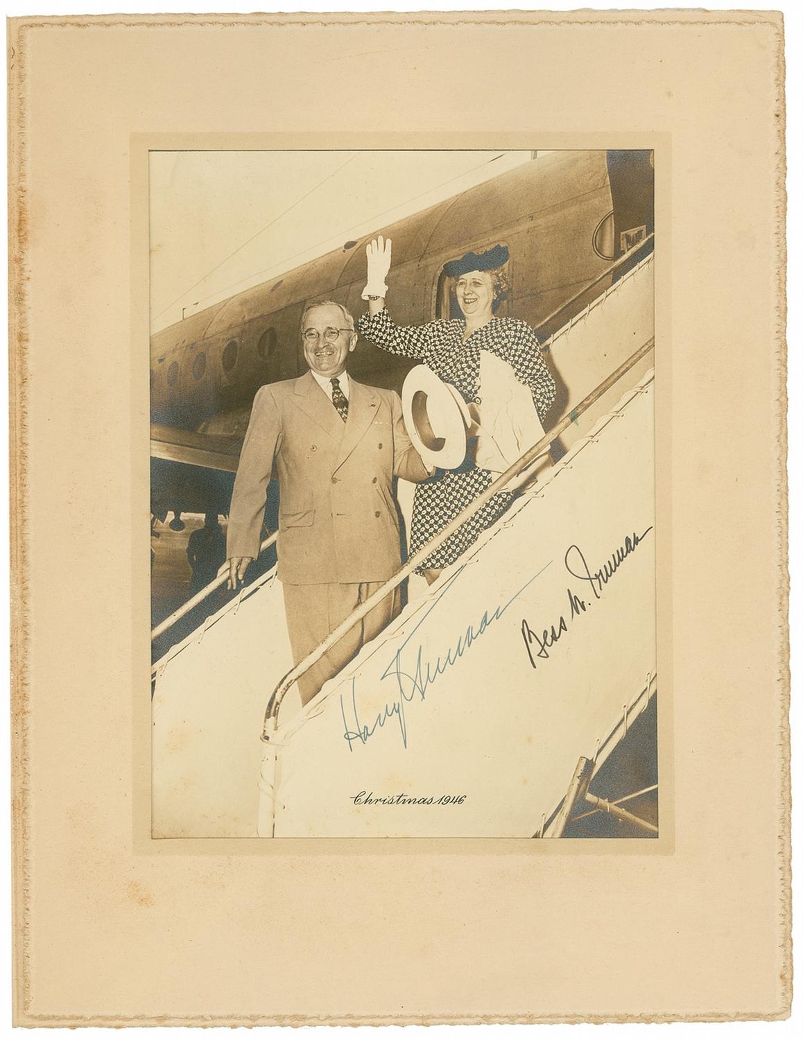 Vintage matte-finish 7 x 9.5 photo of the Trumans waving from the steps of an airplane, bearing the calligraphic notation “Christmas 1946,” signed in fountain pen as President and First Lady “Harry S. Truman” and “Bess W. Truman.” Housed in the original presentation folder measuring 10.75 x 14. In very good condition, with a few light ripples (evidently from glue to reverse), a touch of mild scattered soiling to image, moderate silvering to the darker areas, and soiling and staining to folder. The White House ordered 1,000 copies of this photo, and on December 23, 1946, Truman presented 575 of his White House employees with a signed example.