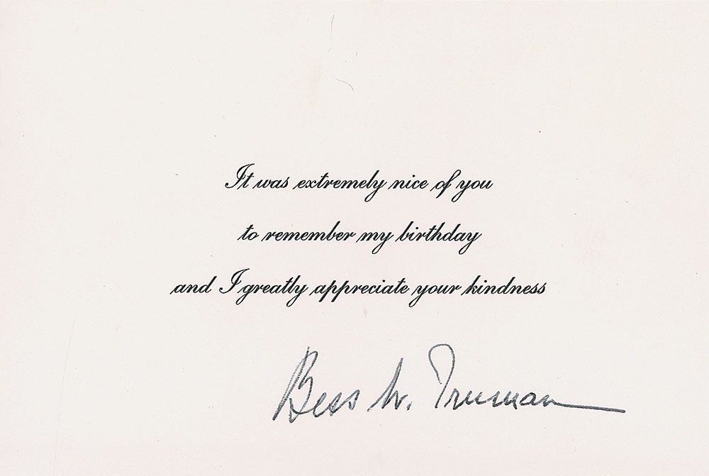 Ballpoint signatures, “Harry S. Truman,” and “Bess W. Truman,” on individual off-white 6 x 4 cards bearing embossed sentiments. In fine condition. Accompanied by original mailing envelopes for both cards.