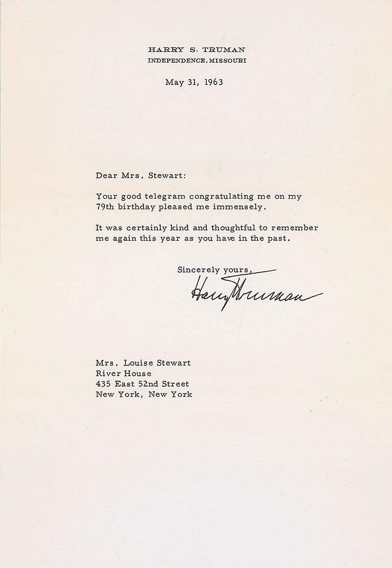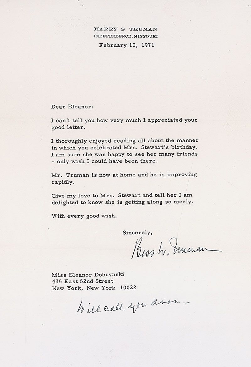 Two letters: TLS signed “Harry S. Truman,” one page, 7.25 x 10.5, personal letterhead, May 31, 1963. In part: “Your good telegram congratulating me on my 79th birthday pleased me immensely”; and a TLS signed “Bess W. Truman,” one page, 7.25 x 10.5, personal letterhead, February 10, 1971. In part: “Mr. Truman is now at home and he is improving rapidly.” In overall fine condition. Accompanied by the original mailing envelopes, both bearing pre-printed free franks.