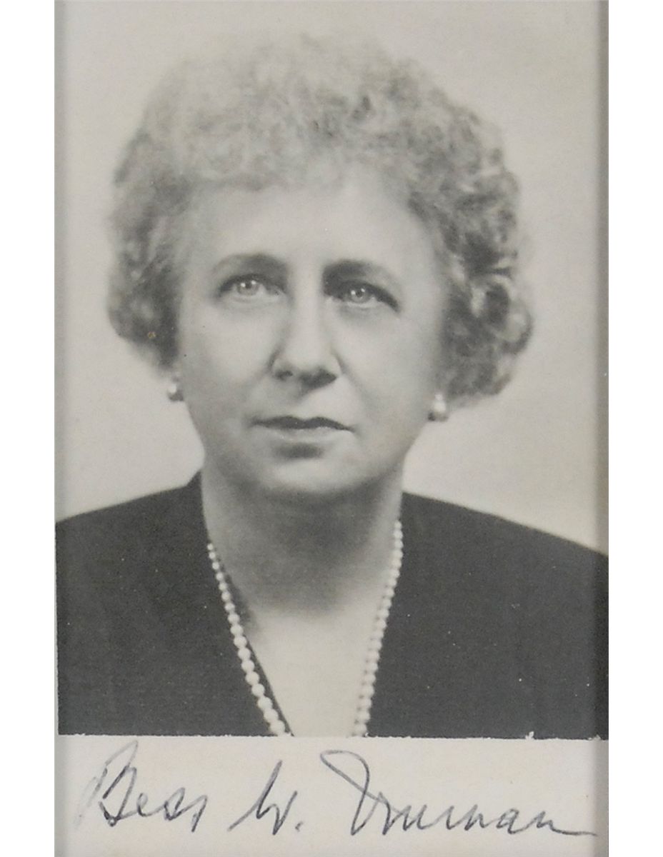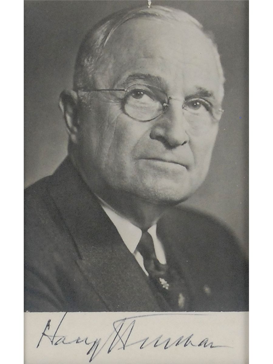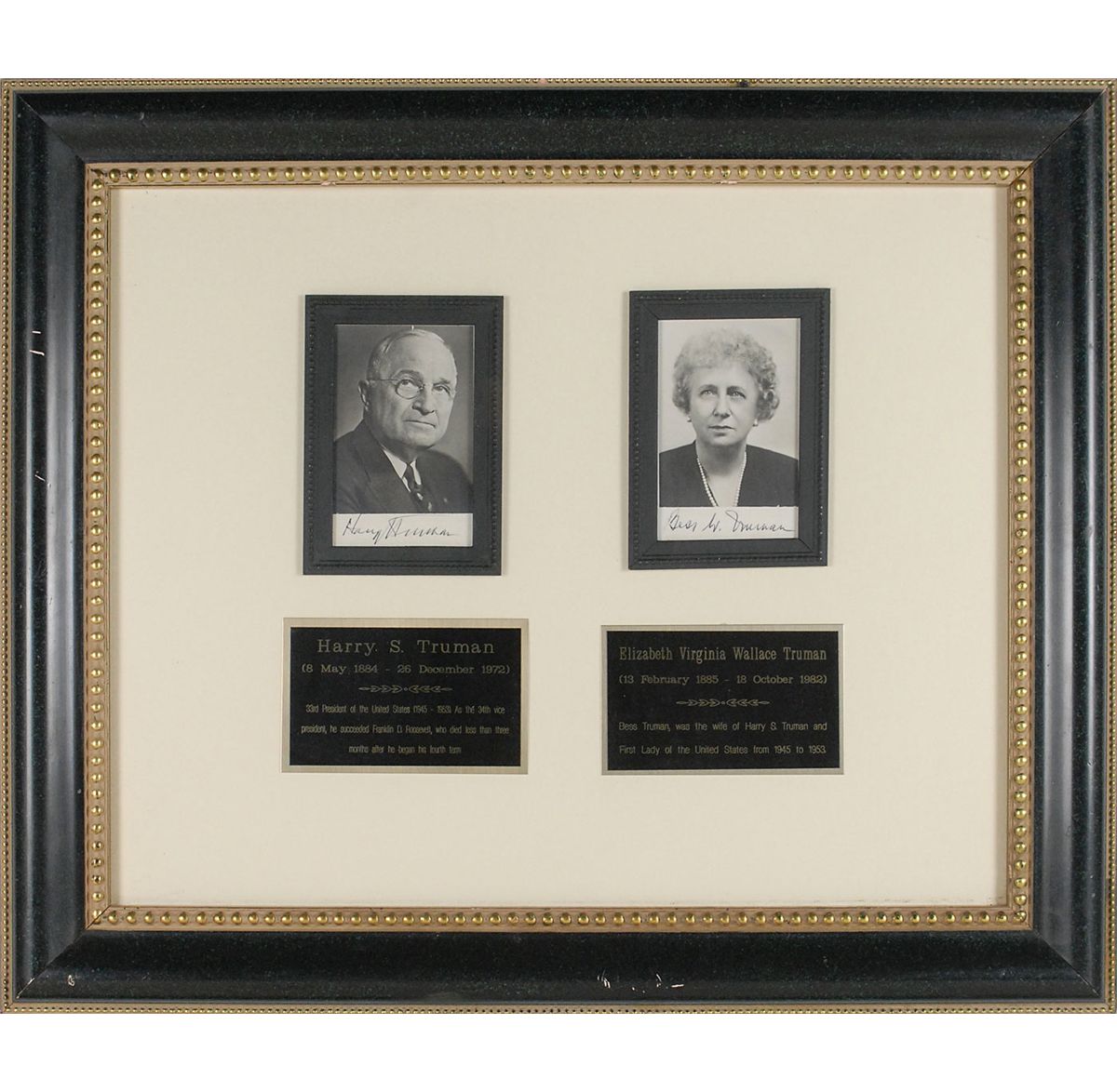 Two signed photos, both approximately 3 x 5, signed in black ink under their images, “Harry S. Truman,” and “Bess W. Truman.” Both the photos are housed in small frames, which are in turn framed together with biographical plaques to an overall size of 24 x 20.5. In fine condition.