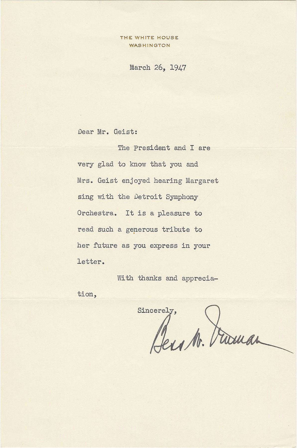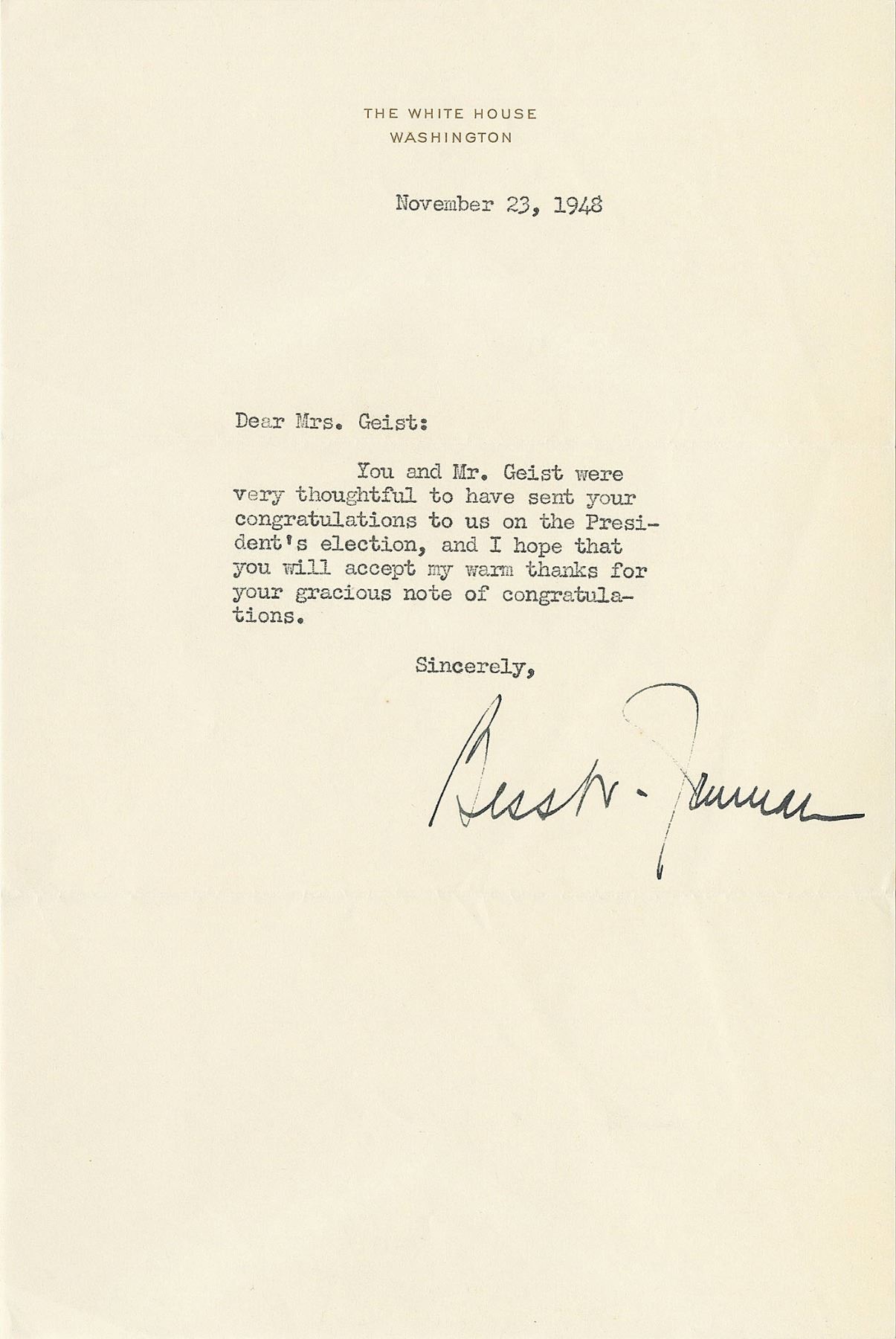 Group of four letters, including one by Harry S. Truman and three by Bess Truman: a TLS as president, signed "Harry S. Truman," one page, White House letterhead, May 26, 1945, thanking a Mr. Geist for birthday wishes; a TLS as first lady, signed "Bess W. Truman," one page, White House letterhead, March 26, 1947, thanking the same man for his “generous tribute” regarding the singing of the Trumans’ daughter, Margaret; a TLS as first lady, signed "Bess W. Truman," one page, White House letterhead, November 23, 1948, expressing thanks for a congratulatory note on Truman’s re-election as president; and an ALS signed "Bess W. Truman," one page both sides, personal letterhead, sending thanks for flowers and kind Christmas wishes. In overall fine condition, with a couple of small stains to the Harry S. Truman letter. Accompanied by the original mailing envelope for President Truman's letter.