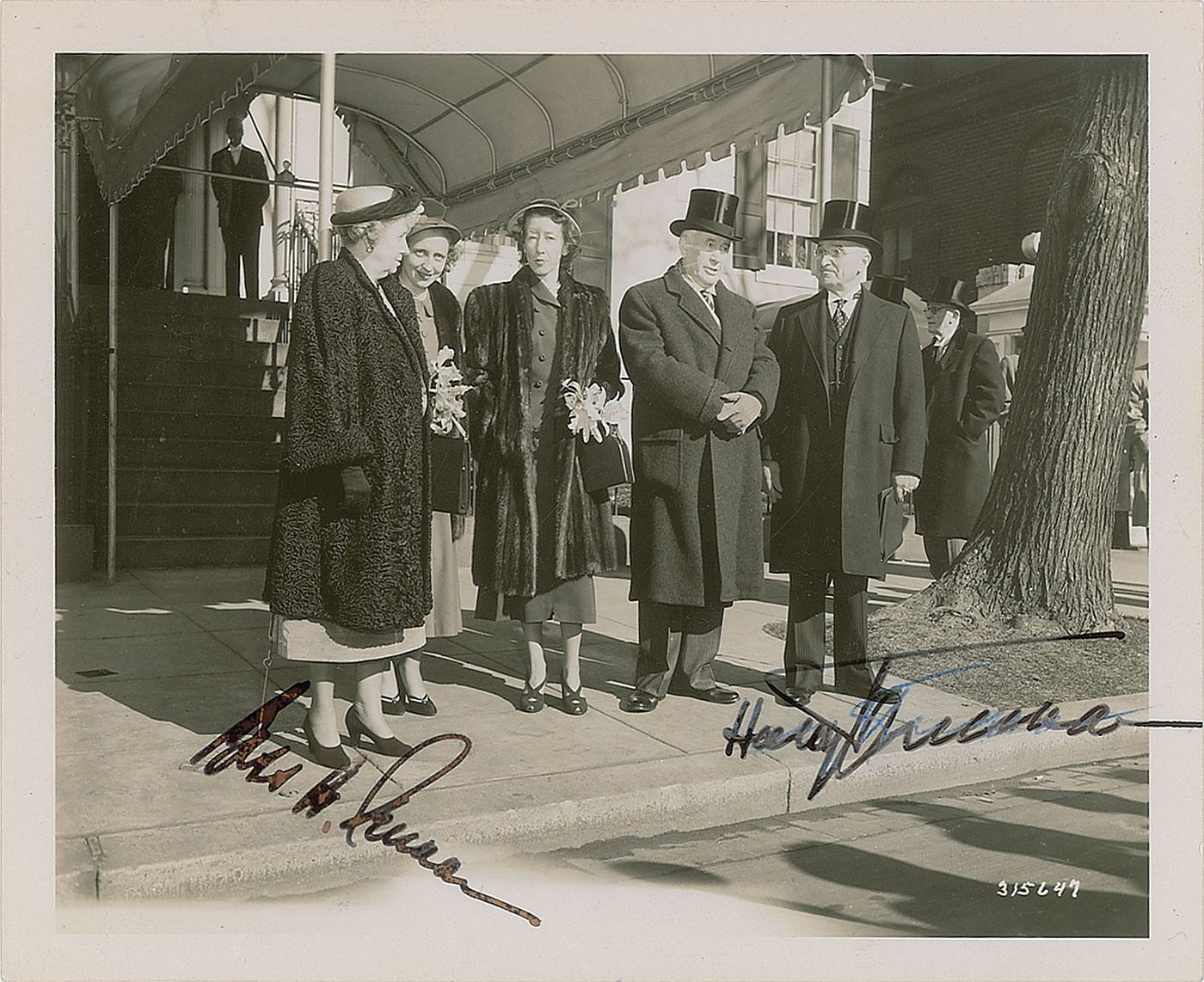 Official US Army glossy 5 x 4 photo of Harry and Bess Truman standing with Alben W. Barkley and two others in Washington, DC, on Inauguration Day on January 20, 1949, signed in fountain pen, "Bess V. Truman" and "Harry S. Truman." In fine condition, with Harry signing boldly in fountain pen over a less successful initial attempt in ballpoint.