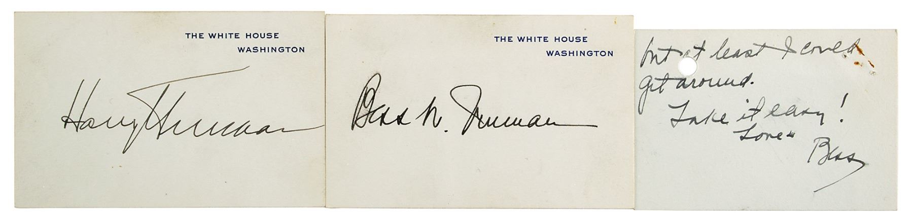 Three items: two official White House cards, individually signed in ink, "Harry S. Truman" and "Bess W. Truman"; and a visiting card imprinted with "Mrs. Truman," bearing an ANS signed "Bess," in part: "Surely am sorry about your bad luck. I fell up these A-steps at Blair House & I don't think I'll ever get rid of the scar." In fine condition, with some faint soiling. Accompanied by a blank White House transmittal envelope for one of the cards.