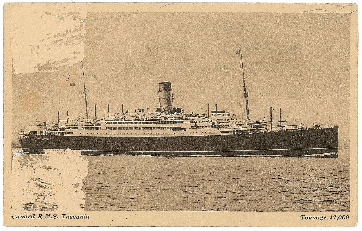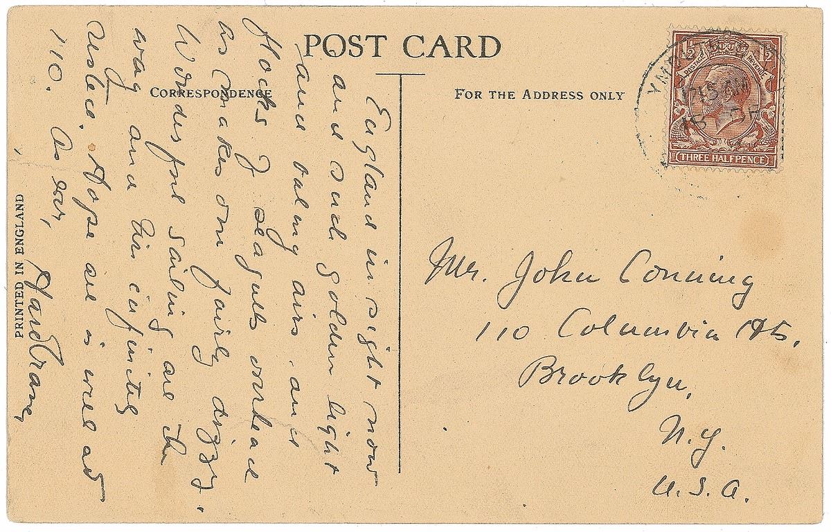 Rare ALS signed “Hart Crane,” one page on a 5.5 x 3.5 postcard depicting the Cunard RMS Tuscania, no date but circa mid-December 1928. Letter to John Conning, a fellow inhabitant of 110 Columbia Heights in Brooklyn Heights, where Crane lived with his lover, Emil Opffer, and was inspired to write The Bridge. In full: “England in sight now and such golden light and balmy airs and flocks of seagulls overhead as makes one fairly dizzy. Wonderful sailing all the way and I’m infinitely rested. Hope all is well at 110.” Also addressed in Crane’s hand, “Mr. John Conning, 110 Columbia Hts., Brooklyn, N. Y., U. S. A.” In fine condition, with some surface loss to front and a couple trivial creases.