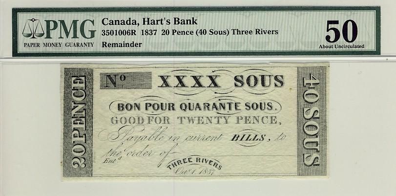 Hart's Bank 1837 20 Pence (40 sous), CH-350-10-06R, PMG AU50