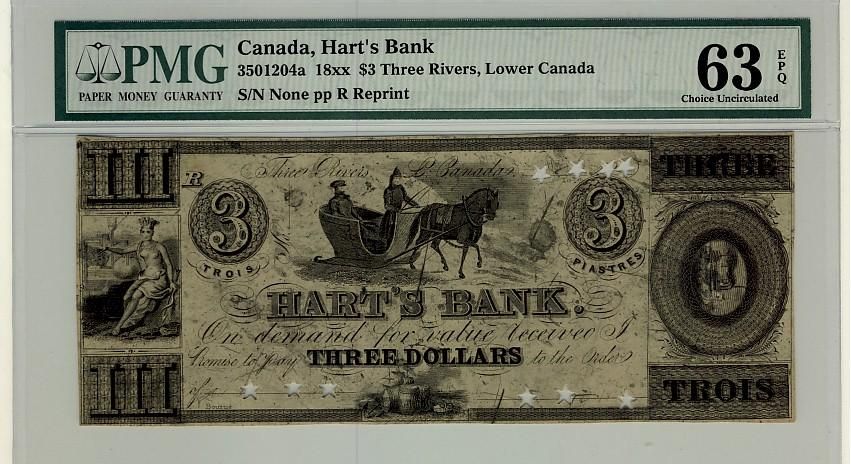 Hart's Bank 18xx $3 , CH-350-12-04a, PMG UNC63 EPQ. The only example graded by PMG