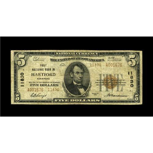 <B>Hartford, AR</B></I> - $5 1929 Ty. 2 <B>First NB</B></I> Ch. # 11830<BR>This piece comes from the sole bank in town to issue Series 1929 examples. It utilizes the third title used by this institution in only six years, and was the only issuing title for small size. Just four Series 1929 notes are known from here, with this the only Type 2 reported to date. <B>Fine.</B></I><BR><BR><b>Shipping:</b> Coin/Currency (<a target="_blank" href="http://www.heritageauctions.com/common/shipping.php">view shipping information</a>)