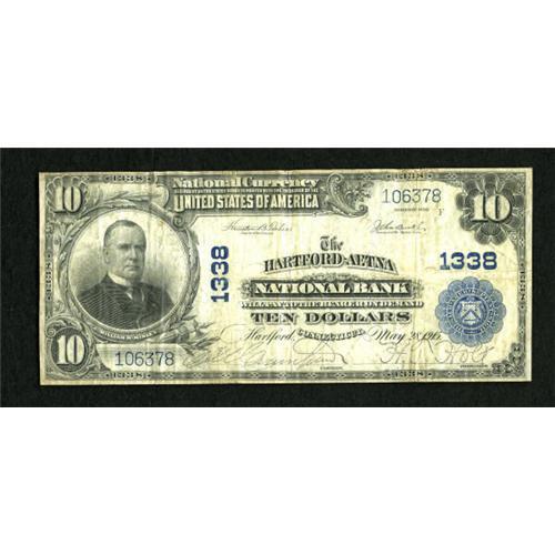 <B>Hartford, CT</B></I> - $10 1902 Plain Back Fr. 632 <B>The Hartford-Aetna NB</B></I> Ch. # 1338<BR> Nice edges for the grade adorn this $10 that has printed officer signatures. <B>Fine+.</B></I><BR><BR><b>Shipping:</b> Coins & Currency (<a target="_blank" href="http://www.heritageauctions.com/common/shipping.php">view shipping information</a>)