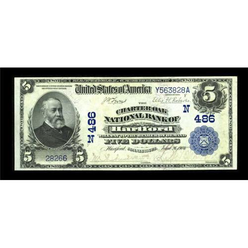 <B>Hartford, CT</B></I> - $5 1902 Date Back Fr. 590 <B>The Charter Oak NB</B></I> Ch. # (N)486<BR> A lovely note with a wonderfully evocative and uniquely Connecticut title. The Charter Oak story is part and parcel of this state's civic life, commemorating events of the night in October of 1687 when newly appointed Governor of New England Sir Edmund Andros arrived in Hartford to demand the surrender of Connecticut's Royal Charter which had been granted twenty five years earlier. During a heated evening meeting between the colony's leaders and the royal entourage at Butler's Tavern over Andros' demand to seize the charter, the room was plunged into darkness when the candles that illuminated it were overturned. No one knows whether this was an accident or a crafty maneuver by the aggrieved colonists, but what is known is that Captain Joseph Wadsworth, who was positioned outside the tavern, found himself in possession of the document during the ensuing chaos in the darkness. Wadsworth took it upon himself to hide the charter in a majestic white oak tree on a nearby estate, hence the name "The Charter Oak." Wadsworth's bold move served to preserve not only the document but the rights of the colonists. Recovered later, the Royal Charter now occupies a place of honor in the Connecticut History Museum, and the Charter Oak itself is commemorated on the Connecticut state quarter. <B>About Uncirculated,</B></I> a beautiful note which reminds us why we collect these wonderful artifacts of our nation's history. <BR><BR><b>Shipping:</b> Coins & Currency (<a target="_blank" href="http://www.heritageauctions.com/common/shipping.php">view shipping information</a>)