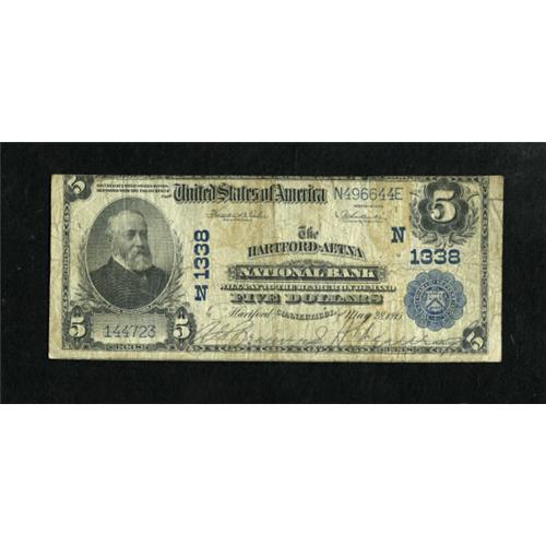 <B>Hartford, CT</B></I> - $5 1902 Plain Back Fr. 606 <B>The Hartford-Aetna NB</B></I> Ch. # (N)1338<BR> Some stains, pinholes and a few margin tears are noticed on this well signed example. <B>Good-Very Good</B></I>.<BR><BR><b>Shipping:</b> Coins & Currency (<a target="_blank" href="http://www.heritageauctions.com/common/shipping.php">view shipping information</a>)