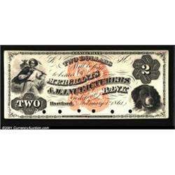 Hartford, CT- Merchants & Manufacturers Bank $2 Feb.<p>1, 1861 G4aA second Proof from this treasure trove. Uncirculated, 6 POC, with a red "2" overprint. Important notice: We expect to be auctioning lots at the rate of 200-250 per hour. Sometimes eBay Premier live bid software cannot keep up with that pace, so we strongly recommend that you place a realistic proxy bid now as insurance to avoid disappointment. Also please note that all Heritage/CAA lots purchased through eBay Premier carry a 20% Buyer's Premium.