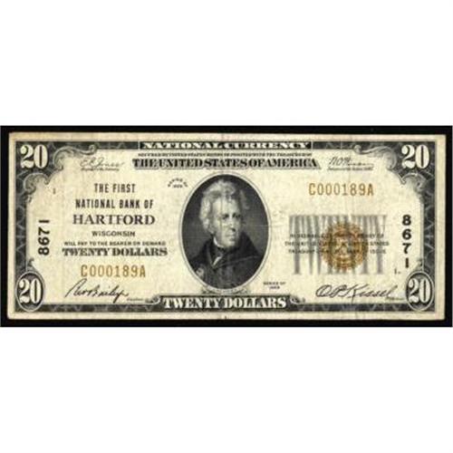 Hartford, WI. $20 1929 Ty. 1. The FNB. Charter #8671. Very Fine.